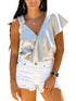 Introducing the Sweet And Sassy Bodysuit by GLAM, perfect for making a statement in elegant champagne. This women's bodysuit features short sleeves with two types of ruffles and a stylish V-neckline. Crafted with a fabric composition of 100% polyester, complemented by contrast material of 85% nylon and 15% spandex for added stretch. It comes with a convenient snap closure, ideal for vacation wear. Model height is 5’6", wearing a size small.