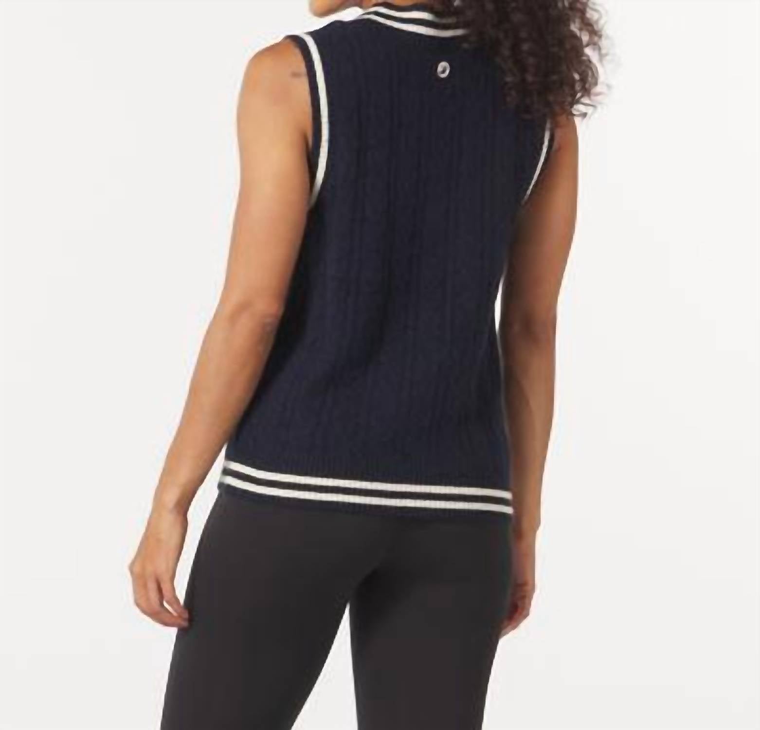 Conheça o Colete Hanalei da Glyder, uma mistura perfeita de estilo aconchegante e clássico em um corte relaxado. Este colete sem mangas apresenta um design texturizado e luxuosamente macio em malha trançada com mistura de cashmere, em uma paleta chique de azul-marinho e branco. Com um decote em V levemente quadrado, é uma peça versátil para sobreposições que pode ser usada sem esforço sozinha ou por cima de uma blusa. Fechamento: Puxe para vestir.