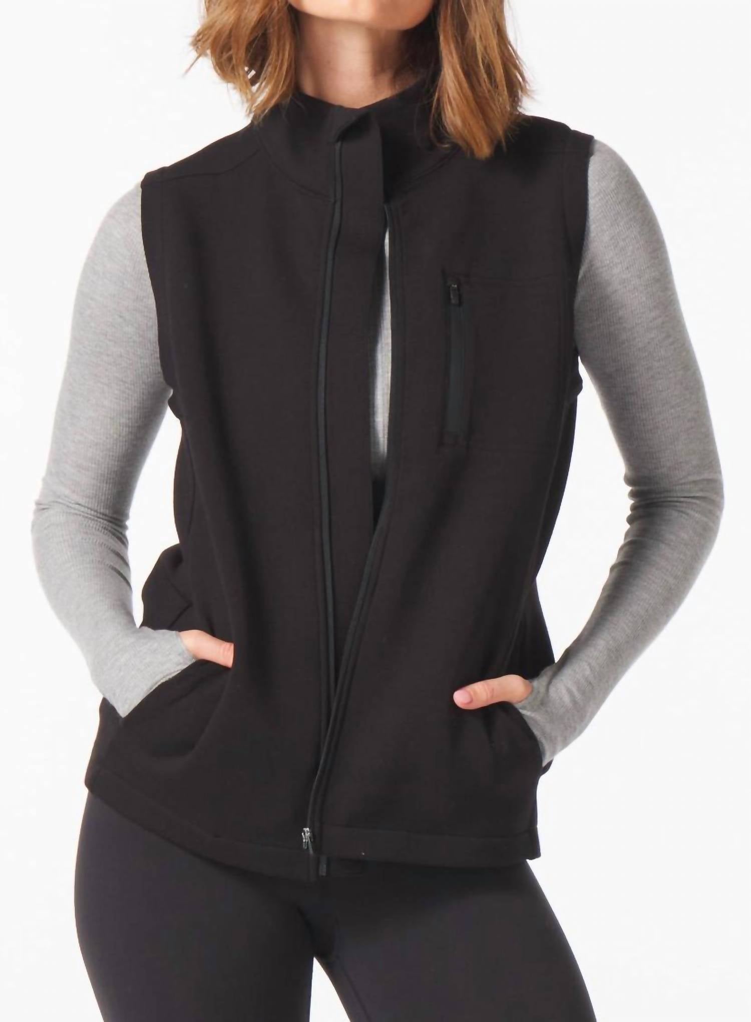 Eleve seu look com o Colete Glyder Scuba, a personificação da versatilidade chique em preto sólido. Desenhado com gola alta e perfil sem mangas, esta peça garante estilo e conforto. Cuidadosamente confeccionado sem forro e com bolsos práticos, é perfeito para usar em camadas. Originário de um local não especificado, este colete feminino combina com facilidade um design moderno com um charme funcional.