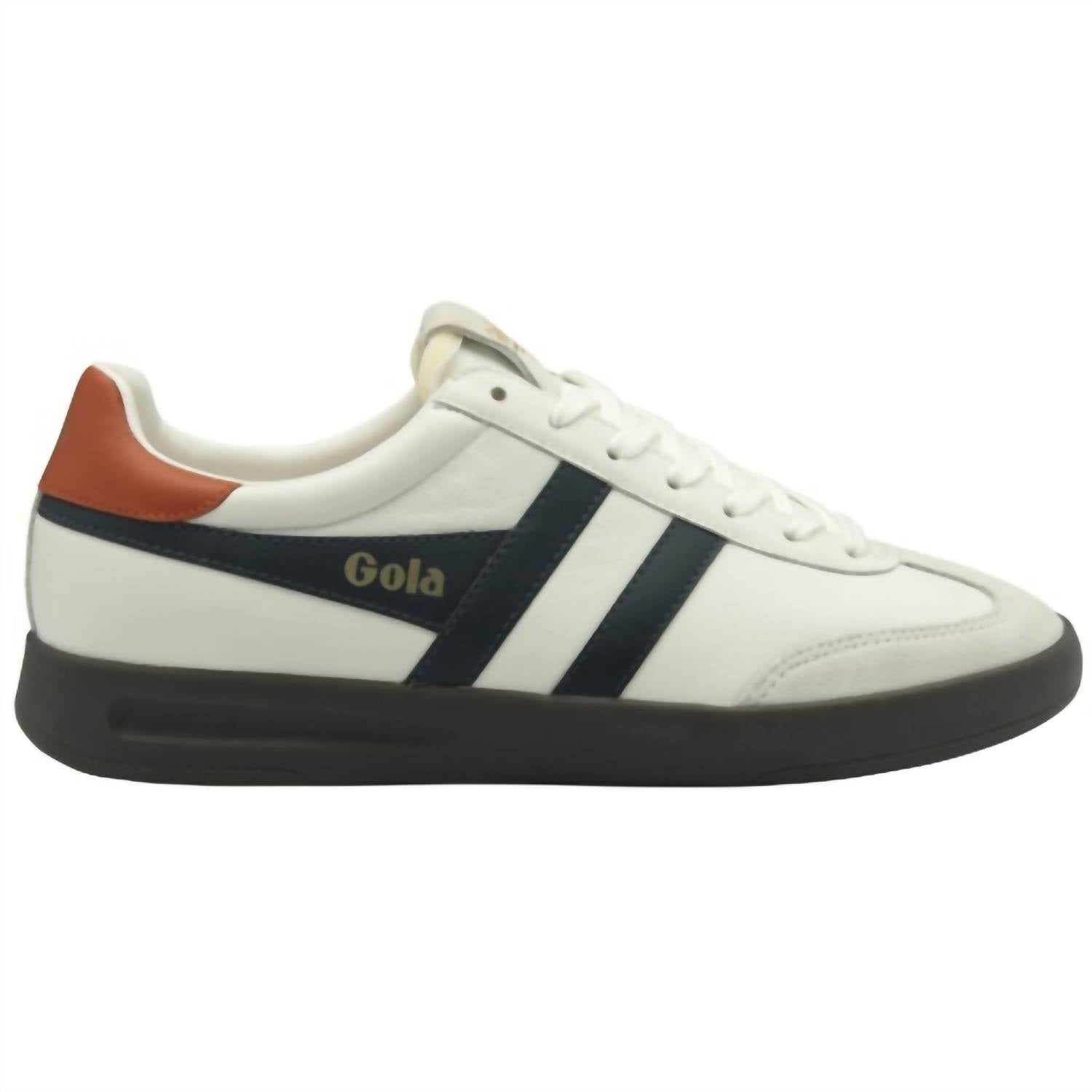 Introducing the Men's Cyclone Leather Sneaker by Gola, designed with a combination of white leather and suede accented by a navy wingflash for a fresh, modern aesthetic. These lace-up retro trainers feature a dark gum sole for added style, perfect for everyday wear with a flat heel and round toe design. Ideally suited for streetwear trends, this sneaker is an excellent choice for summer vacations. Enjoy the contemporary look of classic color blocking in white, navy, moody orange, and dark gum.