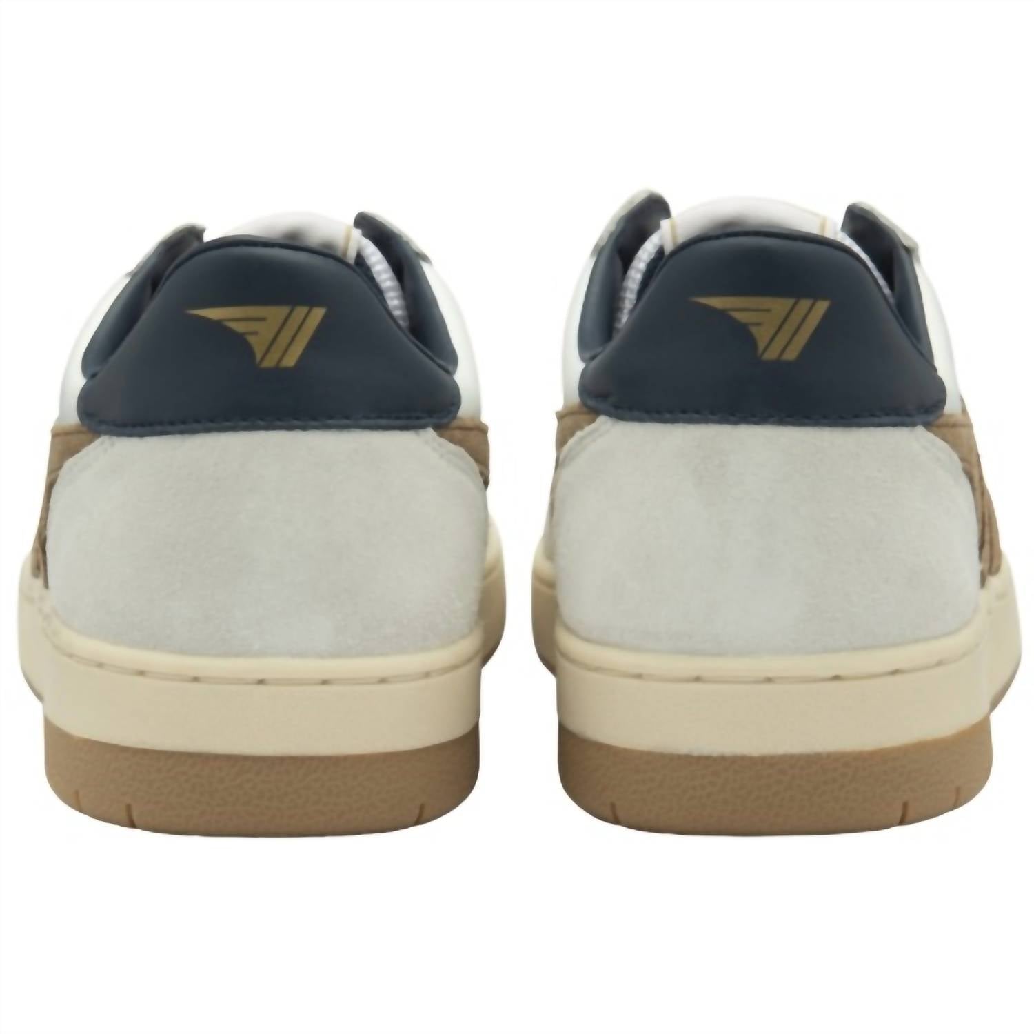 Step into summer style with the Gola Men's Hawk Sneakers, a perfect blend of retro charm and modern comfort for an effortless streetwear look. These sneakers feature a timeless court-sport design crafted from a mix of leather, suede, and mesh in a versatile white, tobacco, and navy colorway. Designed with a two-color cup sole and a round toe, they give off an authentic '80s vibe, making them an ideal choice for vacation and everyday adventures. With a flat heel, these heritage-inspired sneakers are your go-to for a relaxed, fashionable summer.