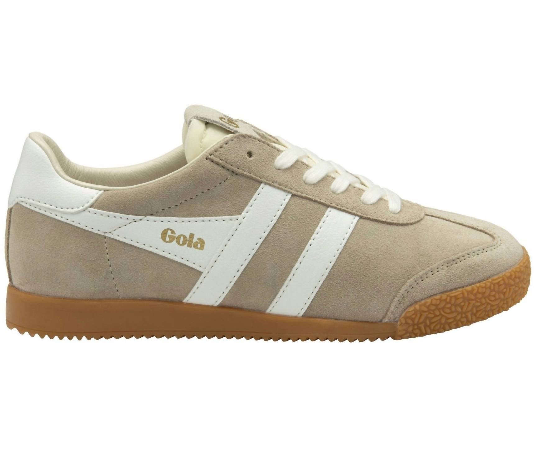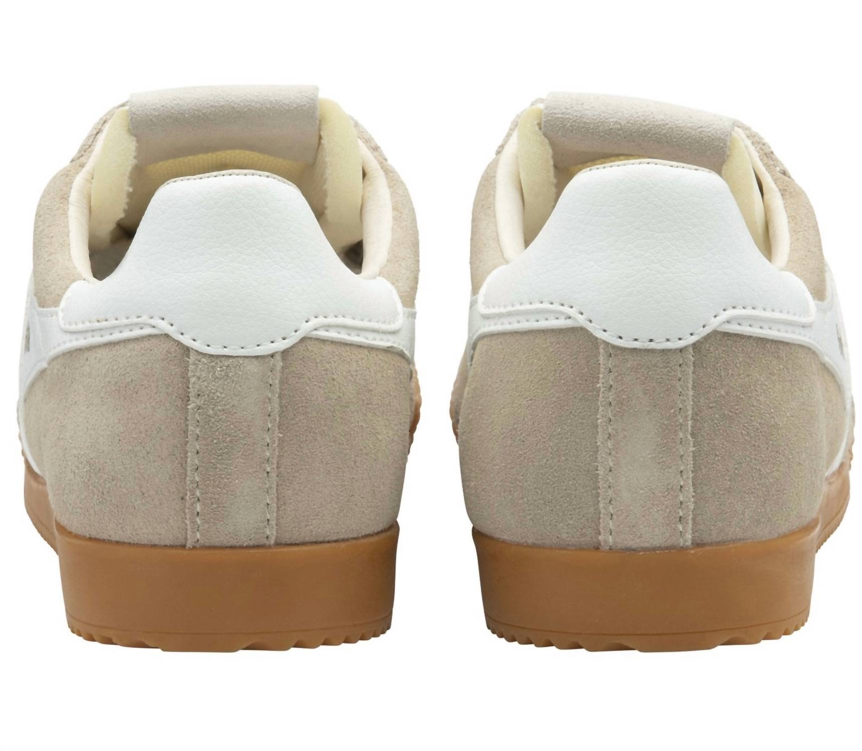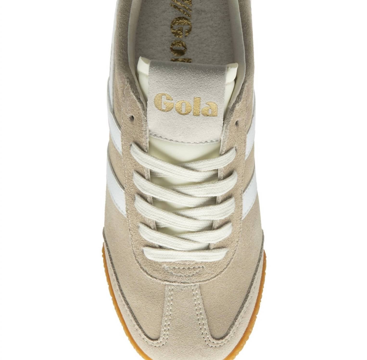 Cute, functional, and comfortable. These sneakers check all the boxes. Introducing the Women's Elan Trainer Shoes by Gola, a fashionable heritage sneaker that combines a nostalgic gum sole with a fresh bone and white palette. Designed as a lace-up sneaker, it features a premium suede upper for a rich texture and a round toe shape for classic appeal. Emphasizing its roots in traditional sports style, this shoe offers a medium width and a flat heel for everyday comfort. Perfect for the summer season, this style is quickly becoming a favorite among fans.