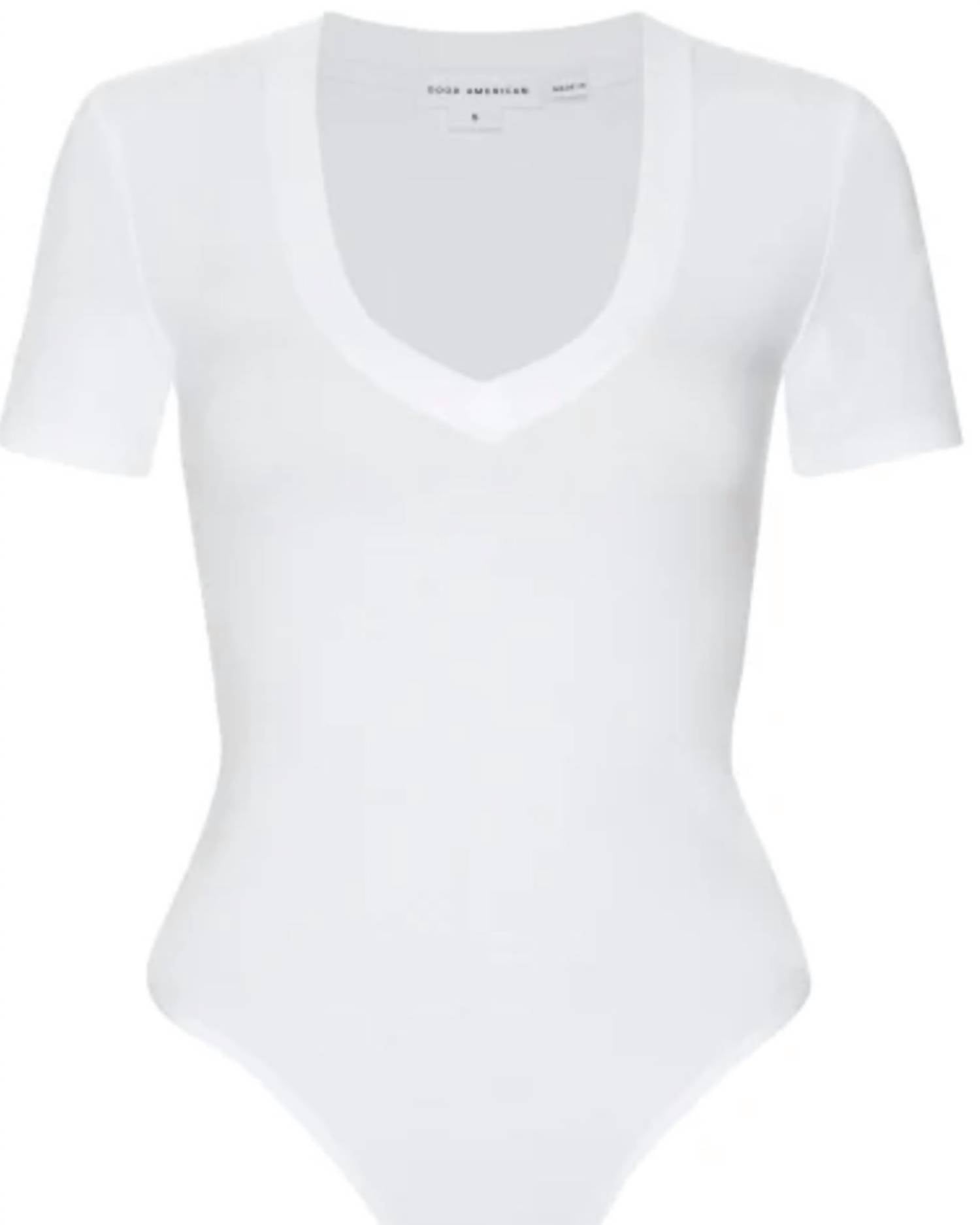 Meet the Women's Super Stretch Deep V-neck Bodysuit by Good American, a must-have for bodysuit enthusiasts. This white, short sleeve bodysuit features a deep V-neckline, crafted from a comfortable and stretchy cotton blend. Composition: 94% Cotton, 6% Spandex. Care: Machine wash and tumble dry for effortless maintenance. Ideal for spring vacations and minimalist wardrobes.