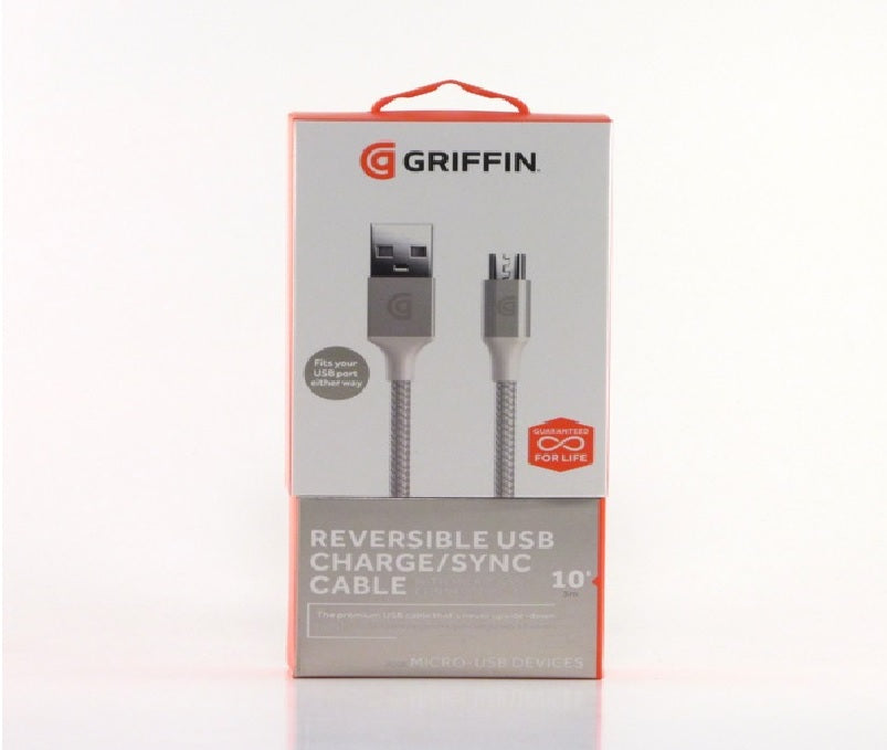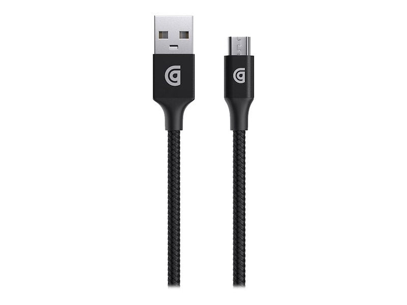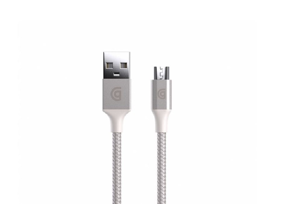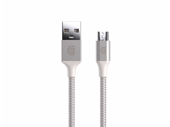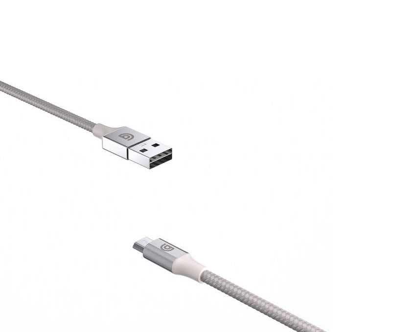 Cabo de carregamento de longa duração com conector micro-USB. | Conector USB reversível de fácil conexão que se conecta a qualquer porta USB de tamanho normal, independentemente da orientação. | Revestimento externo de nylon trançado de alta durabilidade para longa vida útil do cabo sob uso intenso. | Invólucros de alumínio anodizado duráveis protegem ambos os conectores USB