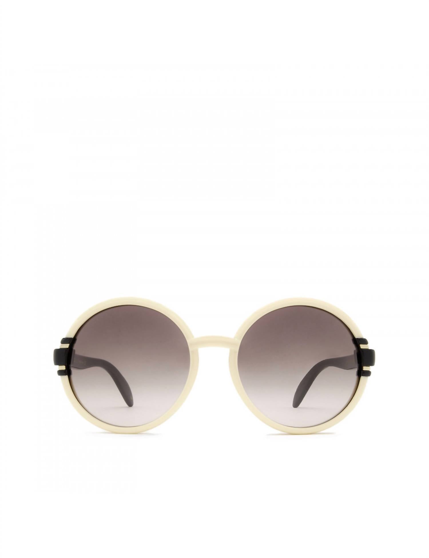 Discover the Women's GG1067S Sunglasses by Gucci, where luxury meets Italian craftsmanship. These round sunglasses feature a full-rim acetate frame with injected plastic offering durability, accented with a distinctive metal GG logo on the temples. The shaded nylon lenses provide 100% UV protection, ensuring your eyes' safety while exuding style. Dimension-wise, they include a lens width of 58 mm, bridge width of 20 mm, and temple length of 140 mm, all in a chic ivory/black frame with brown gradient lenses. Frame Shape: Oval. Origin: Italy.