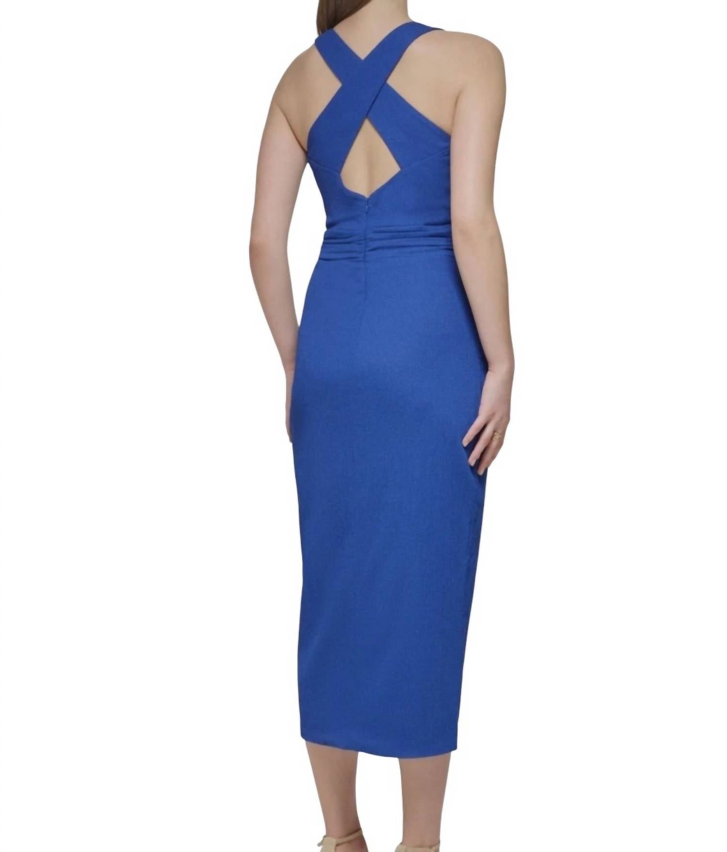 Get ready to turn heads with the Faux Wrap Midi Dress by Guess, a stunning sheath silhouette in an elegant blue hue. This sleeveless dress features a surplice V-neck and is approximately 39" in length from center back neck to hem. Crafted from 98% Polyester and 2% Spandex with a polyester lining, it boasts a chic tulip hem and stylish O-ring hardware at the ruched side waist. Closure: Zip closure. Care: Hand wash and lay flat to dry for longevity.