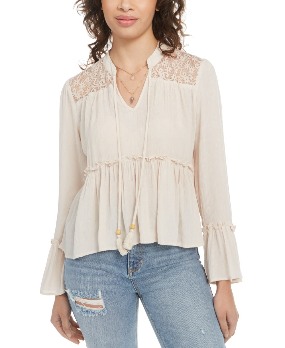 Ajuste relaxado | Decote em V | Detalhe de amarração no peito com borla; renda nos ombros; detalhe de babado na manga e na cintura | Mangas sino | Sem forro