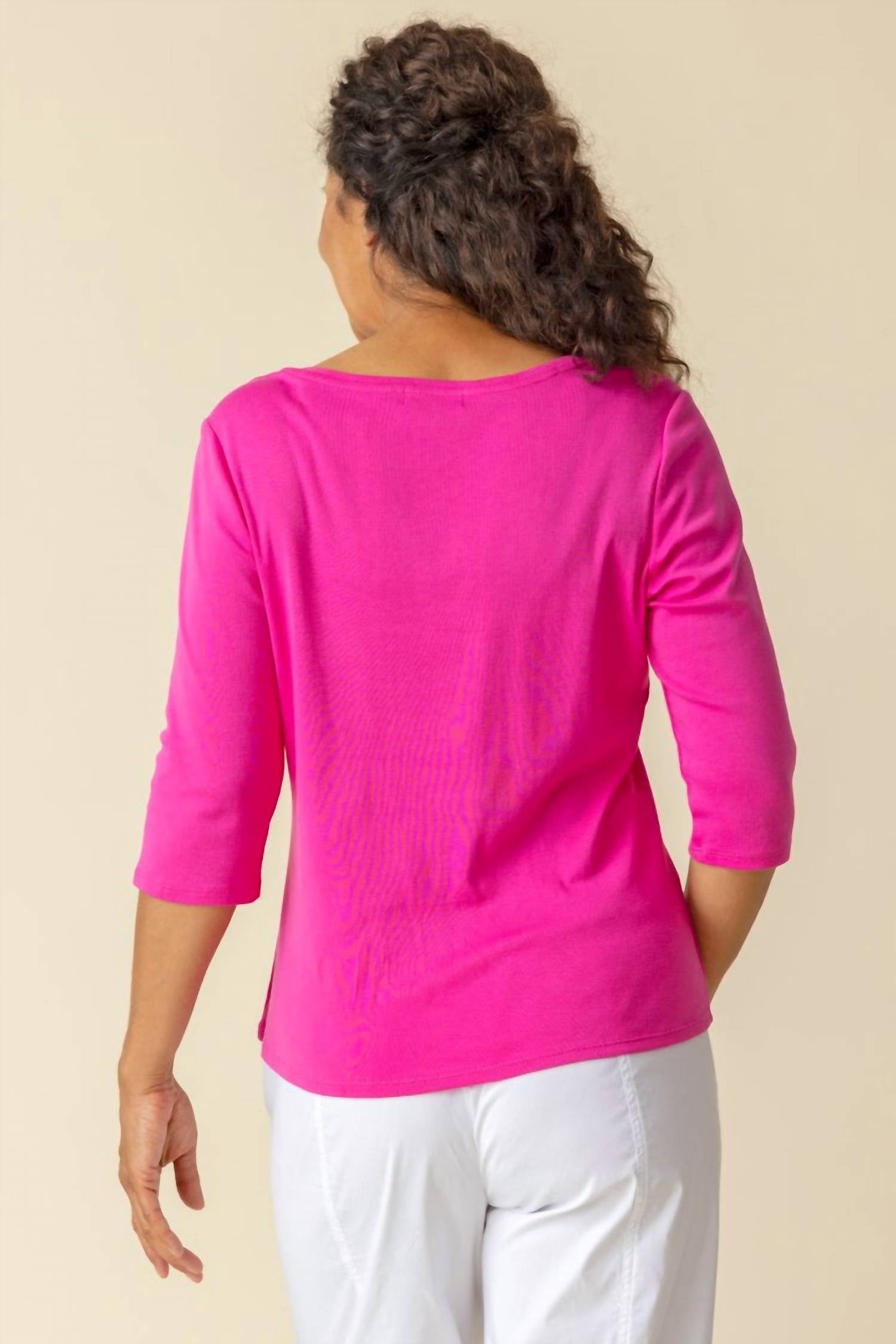 Introducing the Cozy Rib Easy V-Neck Tee by Habitat, a perfect addition to your summer wardrobe. This pink tee features three-quarter sleeves and a textured rib design that adds a touch of style to any travel occasion. Crafted from 100% cotton, it offers a relaxed fit and pull-on closure for ultimate ease and comfort. Care for this garment is simple: machine wash cold and tumble dry low. Measurements include a bust of 34" and a length of 23" for small, gradually increasing in size.