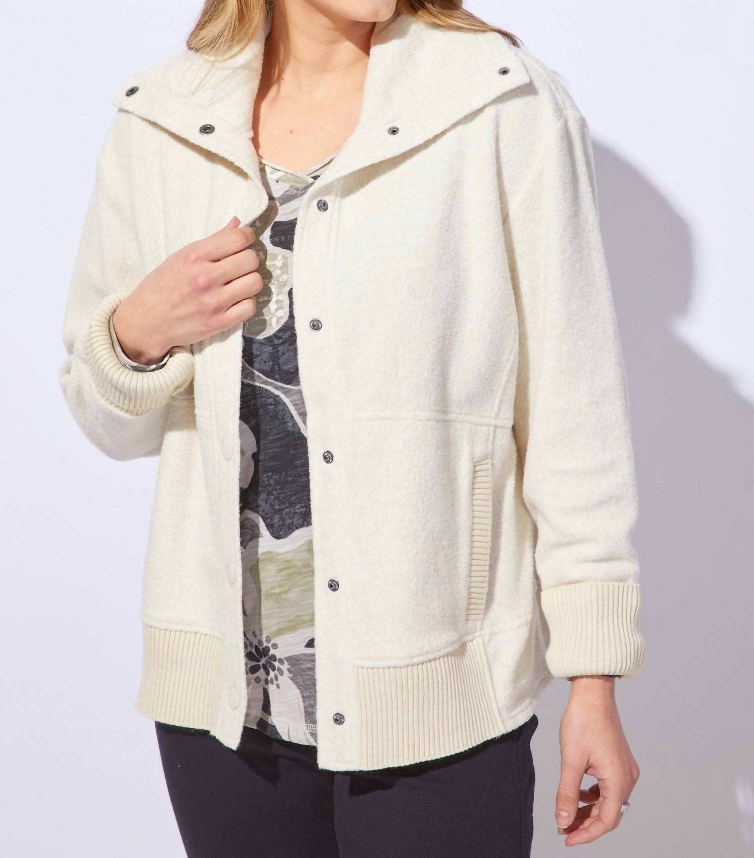 Experience the ultimate blend of cozy and chic with the Heather Fleece Fireside Snap Jacket by Habitat. This ivory casual jacket is crafted from a cotton/polyester fleece, offering a long-sleeve design with a snap closure and an oversized collar. With a relaxed fit, it measures 26.5 inches in front length for size small, featuring built-in pockets for convenience. Easy to care for, machine wash cold inside out with like colors and tumble dry for effortless maintenance.