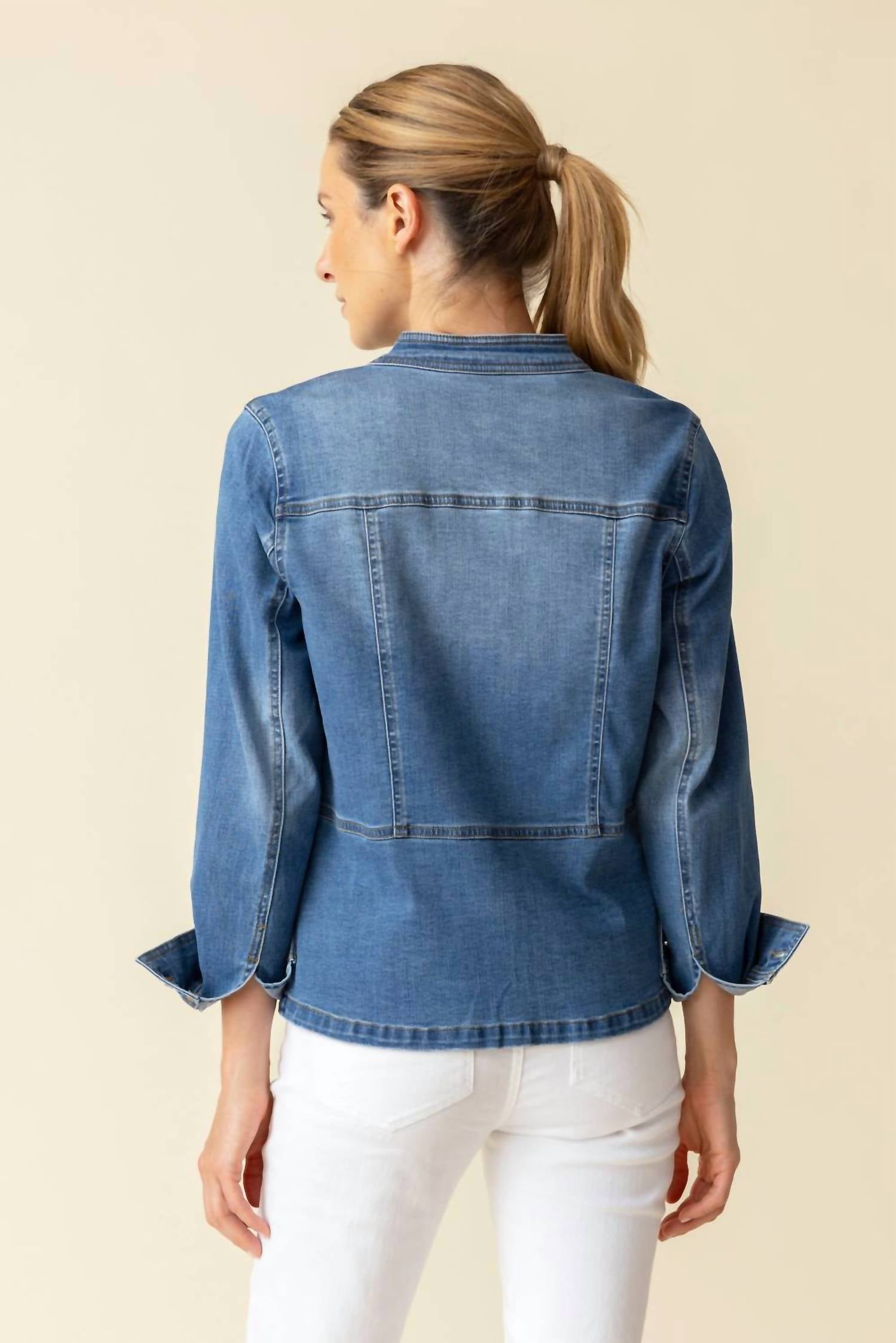 The perfect jean jacket for those slightly crisper days between seasons. Introducing the Essential Spring Jacket by Habitat, crafted for the modern woman in a chic medium denim hue. This long-sleeve jean jacket features a flattering crewneck and is made from a comfortable cotton blend, allowing for easy movement with its 4-way stretch. Composition: 98% Cotton, 2% Spandex, with a button closure and convenient pocket detailing. Care: Machine wash cold on a gentle cycle, cool iron, and tumble dry low. Front length from high point shoulder is 24" and sleeve length is 31 1/4" for size small. Ideal for travel, this vintage-inspired jacket is perfect for the Spring season.