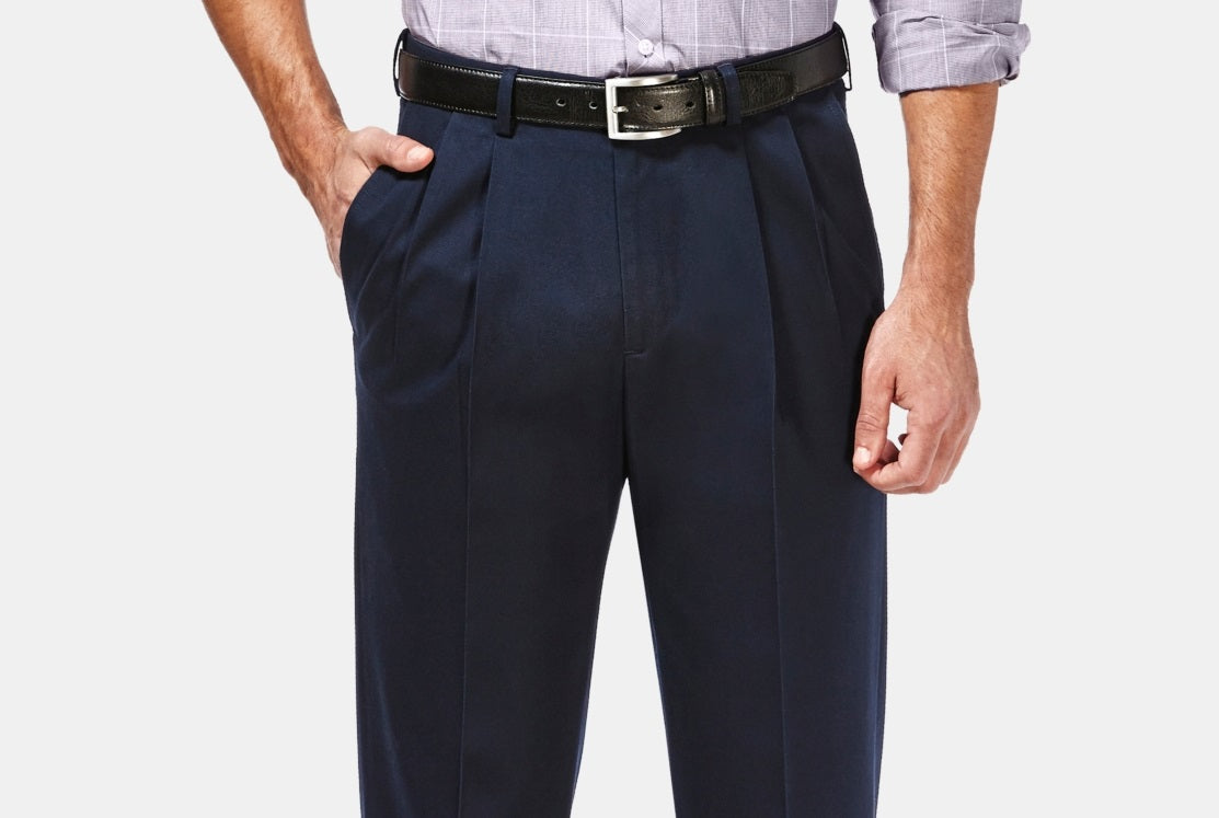 As calças plissadas de corte clássico da Haggar têm a quantidade perfeita de elasticidade espaçosa para mantê-lo confortável em todos os seus ambientes profissionais e formais. | Botões com fecho; passantes para cinto | Frente plissada; bainha | Dois bolsos frontais; dois bolsos embutidos traseiros | Importado
