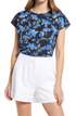 Design de manga curta | Estampa floral azul em leque | Feito de cetim | Tamanho extrapequeno | Marca Halogen | Comprado na Nordstrom | Esquema de cores vibrantes | Sensação de luxo | Tecido de qualidade | Estilo elegante | Toque premium | Cor de base preta