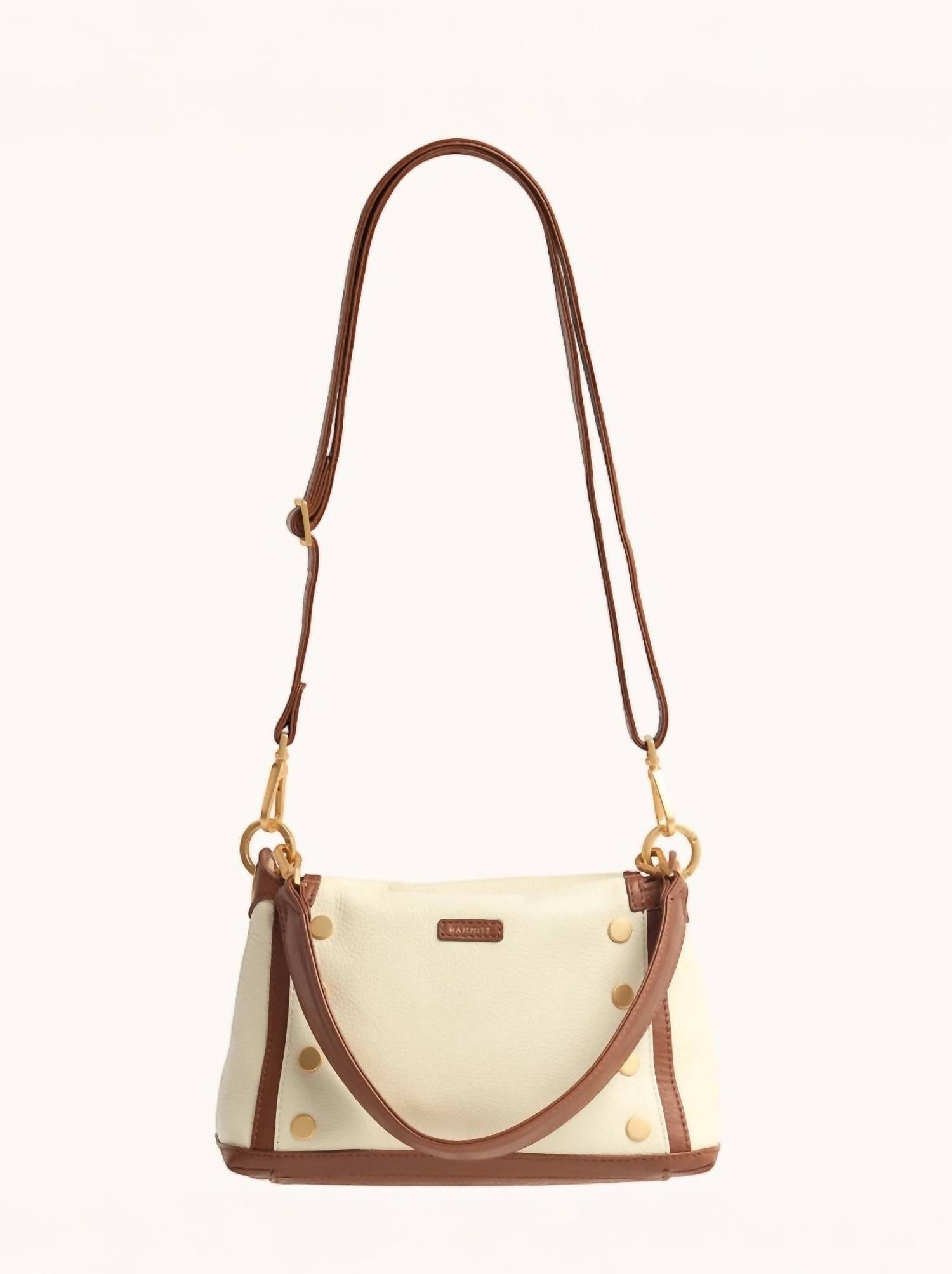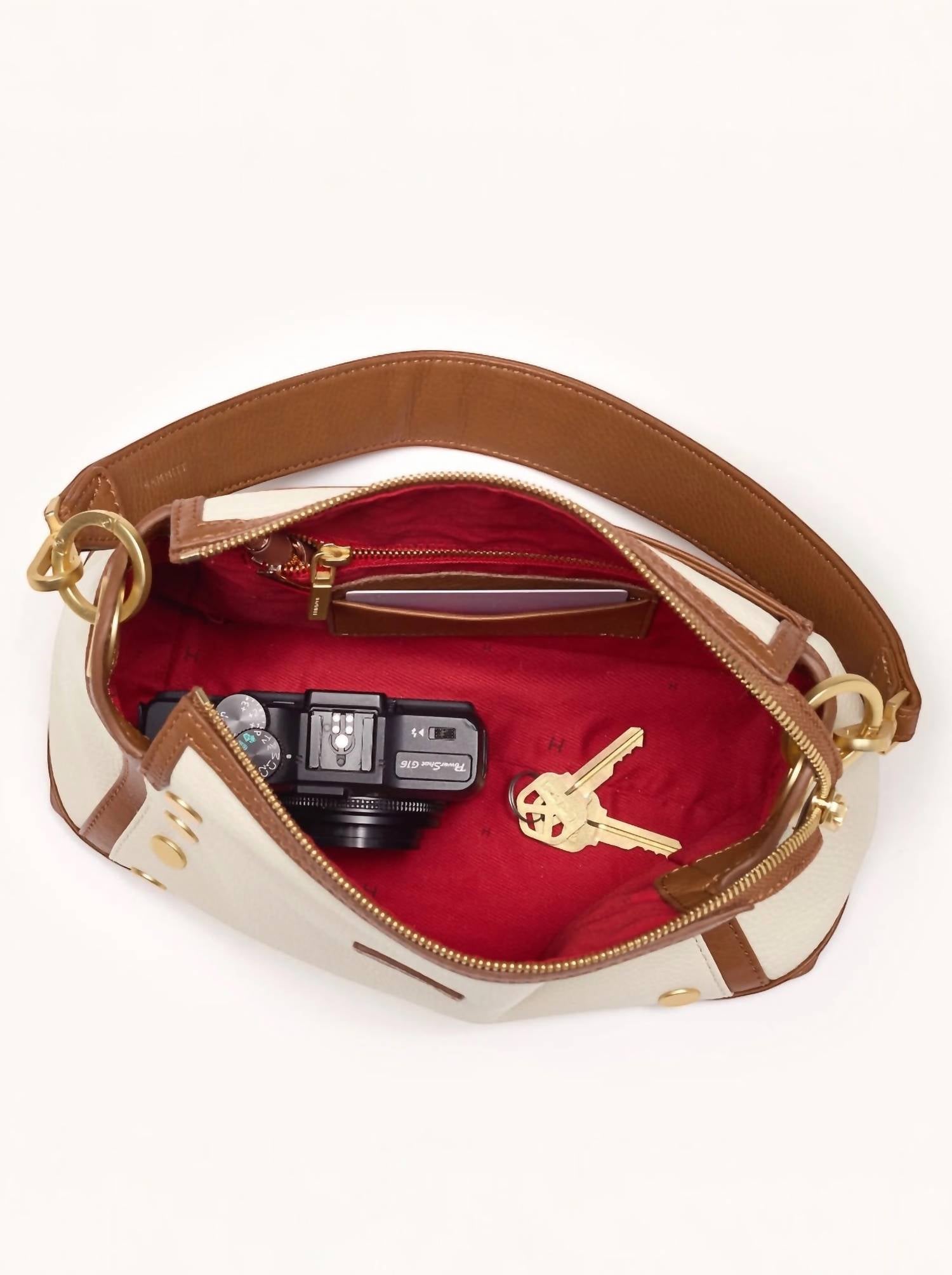 Apresentamos a Bolsa Transversal Bryant Med Courtyard da Hammitt, um acessório elegante e funcional para o seu guarda-roupa. Esta bolsa versátil é confeccionada em couro granulado macio em tons de creme neutro e marrom médio quente, complementada por ferragens douradas escovadas. Possui forro em sarja de algodão vermelho, um prático bolso traseiro para celular e organização interna com compartimento para cartão de crédito e bolso com zíper. Com dimensões de 23 cm de comprimento x 13 cm de largura x 23 cm de altura, ela pode ser usada como bolsa transversal ou de ombro, graças às alças removíveis e ajustáveis.