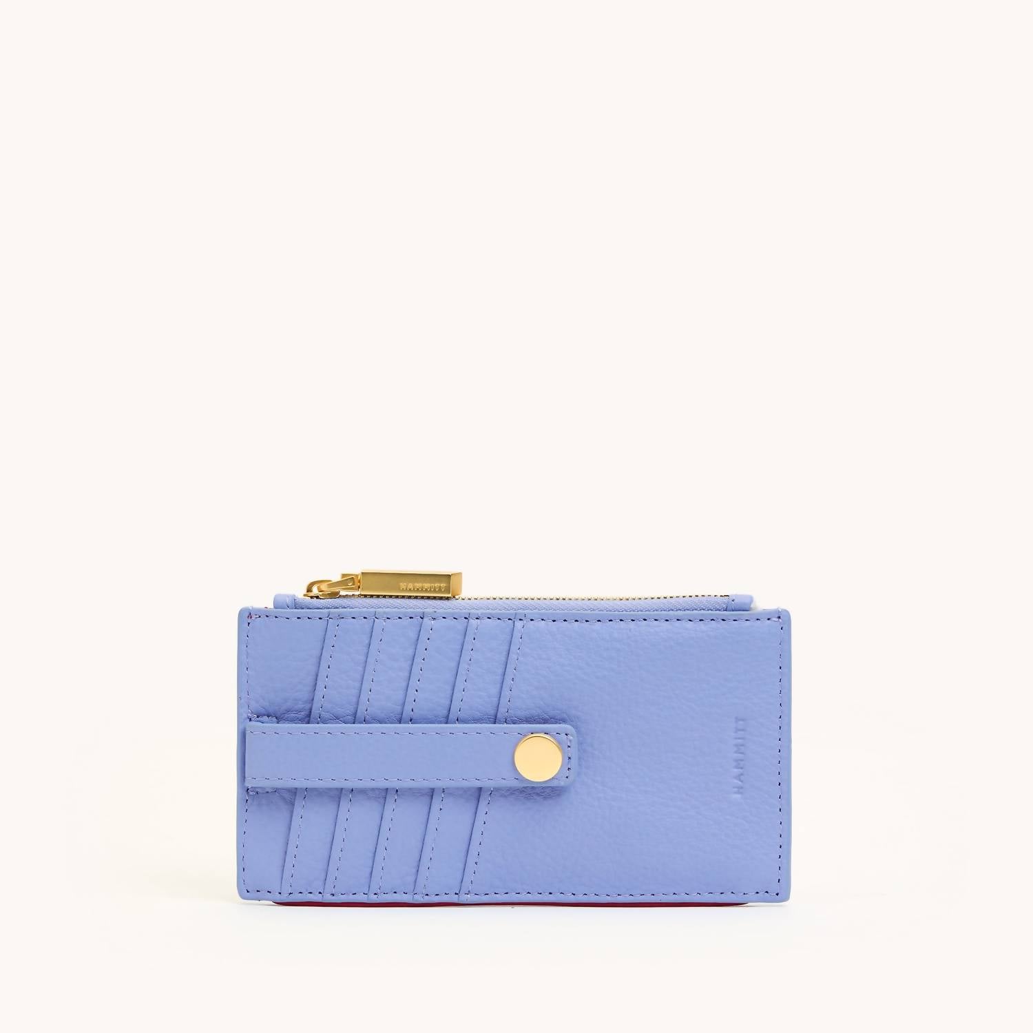 Upgrade your accessories with this chic wallet. Its standout appearance highlights your personal style, while its compartments offer efficient storage for your financial essentials. Meet the Women's 210 West Wallet by Hammitt, a chic and functional accessory in a stunning waterline and brushed gold combination. Crafted from luxurious cornflower blue pebble leather with a soft lavender hint, this wallet includes up to 8 secure card slots and a zippered pocket for extra security. With brushed gold hardware, it's a stylish piece that fits perfectly in any Hammitt bag. Dimensions: 6 inches in width.