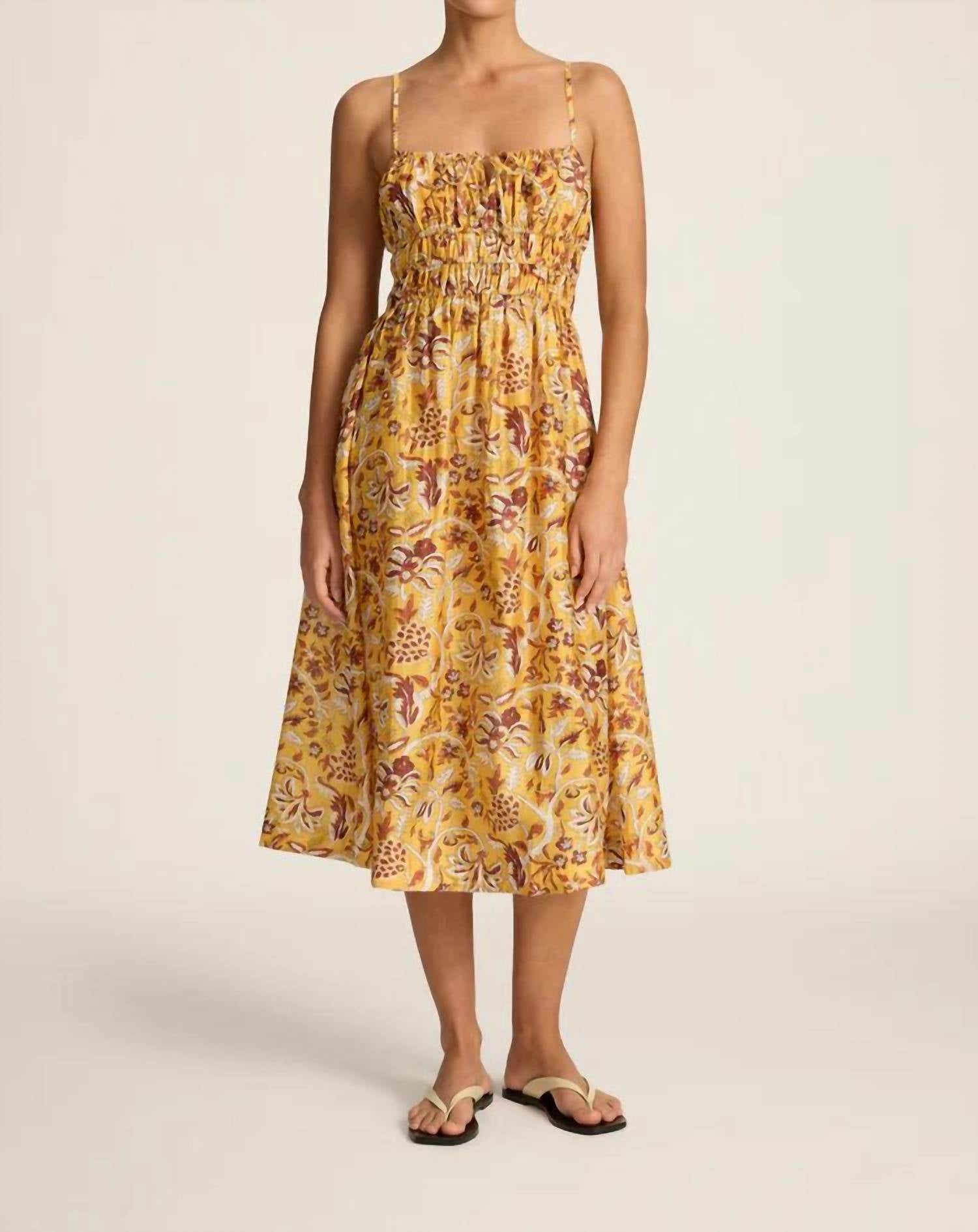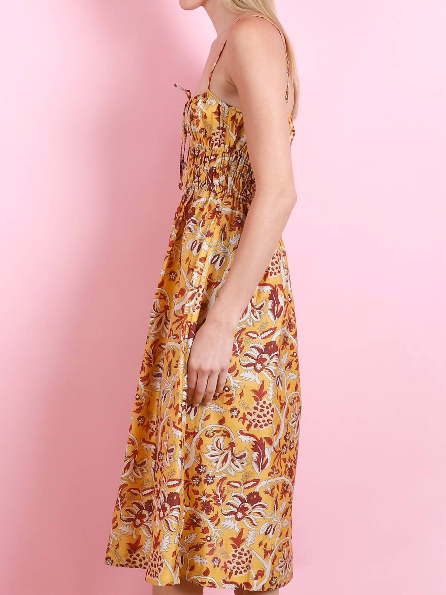 O vestido com o comprimento perfeito existe. Conheça o Vestido Midi Yolanda da Hannah Artwear, uma peça essencial do estilo boho chic, perfeita para o seu guarda-roupa de primavera. Este vestido feminino ostenta uma estampa floral romântica, um corpete franzido charmoso e alças finas ajustáveis, criando uma silhueta deslumbrante em corte A em tons âmbar. Feito de algodão respirável, ele foi projetado pensando na praticidade, com bolsos e fecho de pressão. Para cuidados, basta lavar à mão quando necessário.