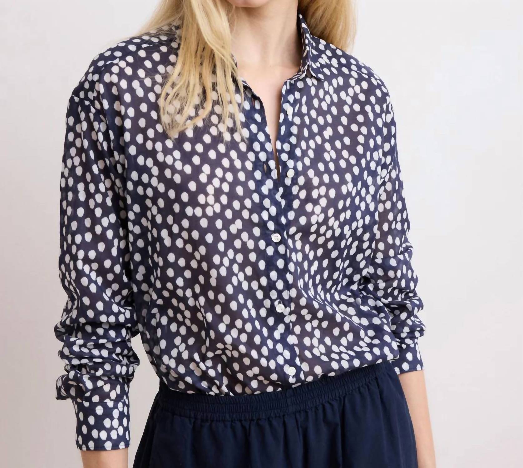A timeless blouse that will never go out of style. Discover the Charlot Woven Shirt by Hartford, a women's blouse offering a blend of casual elegance and timeless style. With its long sleeves and a classic collar, this piece stands out in a navy cotton fabric adorned with an exclusive irregular polka dot print. The button closure ensures a neat fit, making it an ideal choice for vacation wear or adding a maximalist touch to your summer wardrobe. Care instructions are not specified.