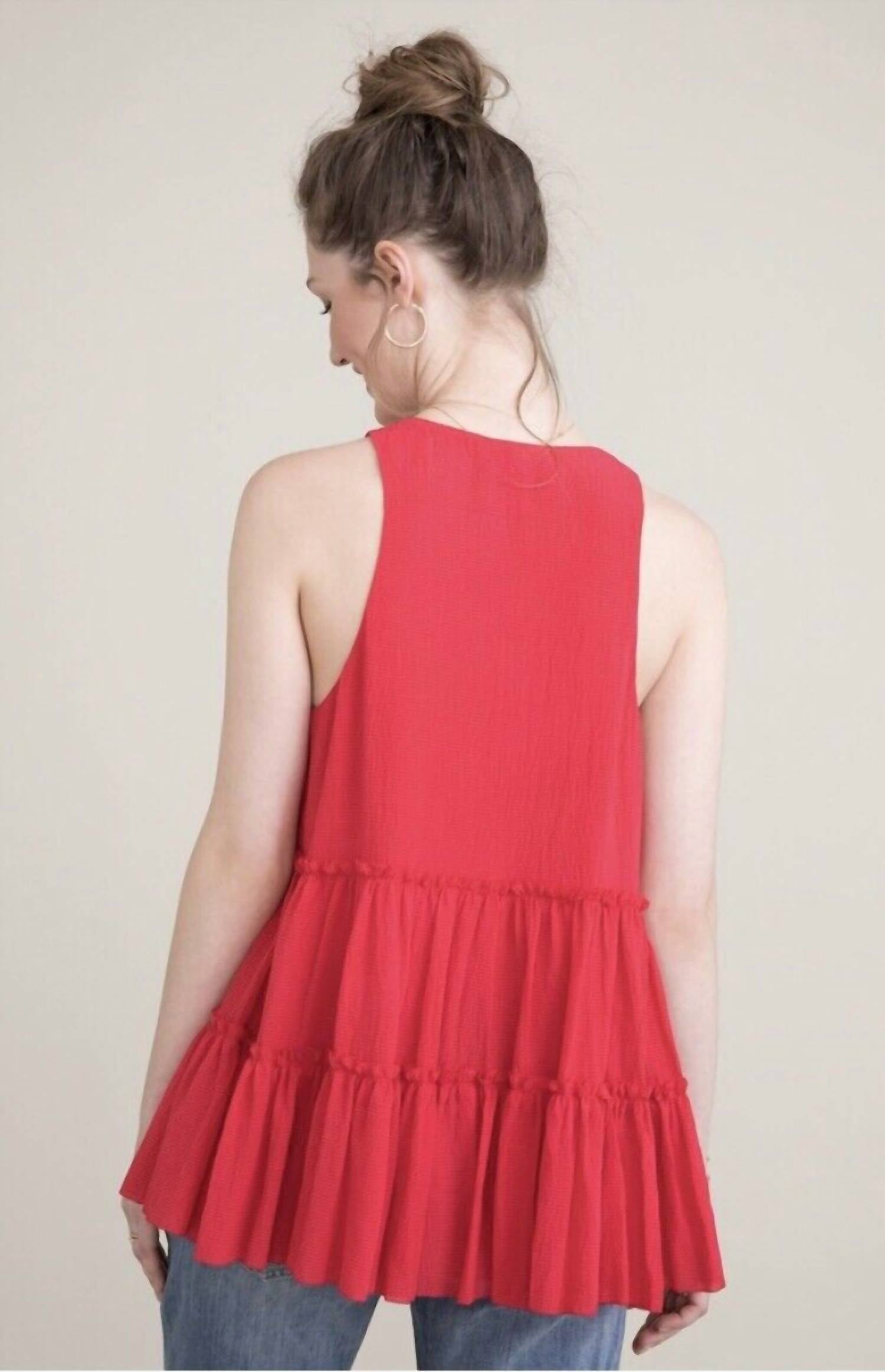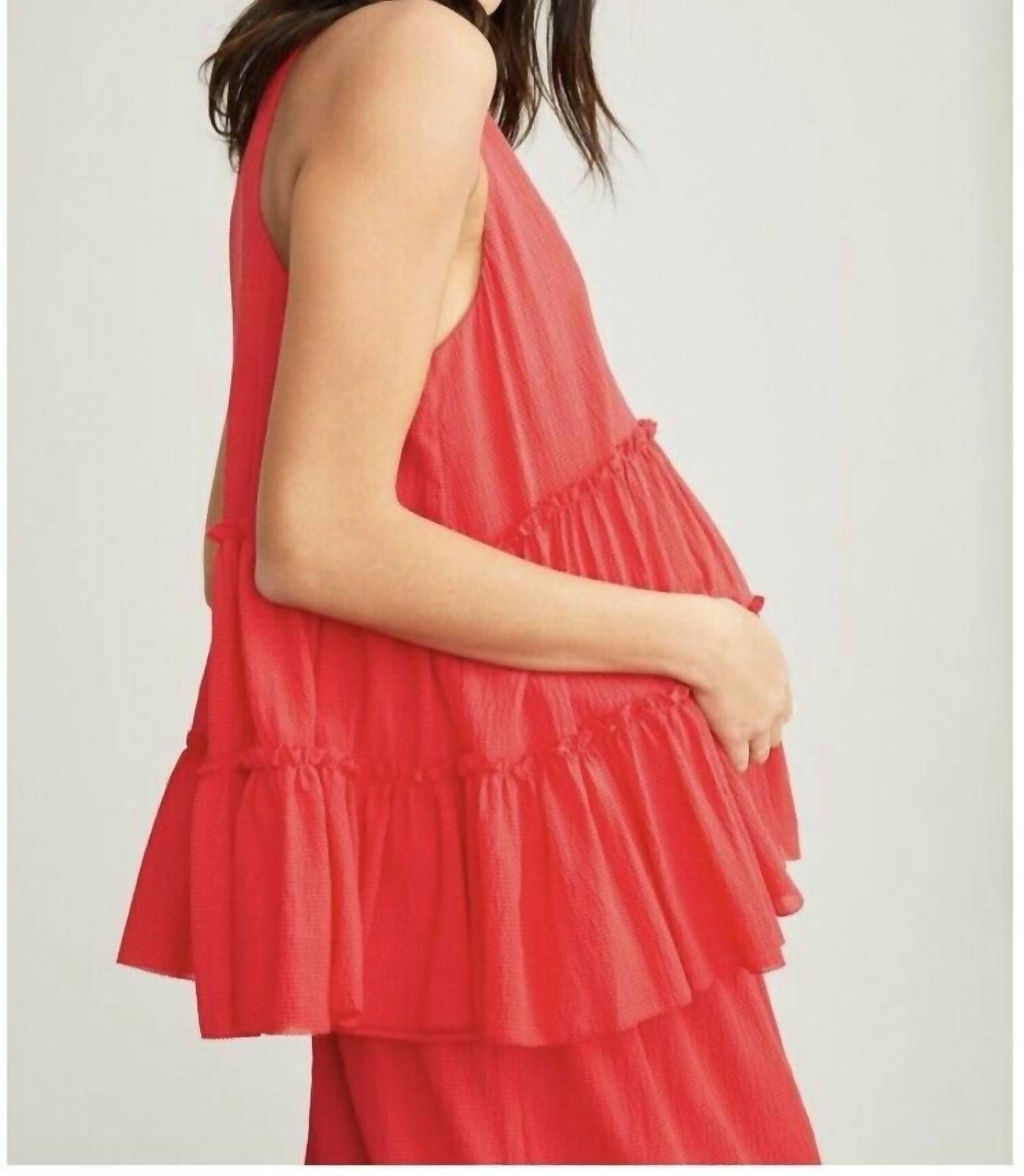 This classic tank top is perfect for layering and cute enough to wear on its own. The Austra Tank Top by Hatch is an elegant maternity piece in a vibrant Punch hue, ideal for versatile styling. This sleeveless design features a V-neck and is crafted from a luxurious 55.5% Silk, 40% Cotton, and 4.5% Spandex blend, offering a lightweight, low-stretch hammered crepe fabric suitable for any stage of pregnancy. Made with tiered seams and flowy ruffled tiers, this waist-length top is effortlessly chic and finished in a pullover style. For the best care, dry clean only; this imported piece from China is perfect for a Spring vacation or minimalist occasion.