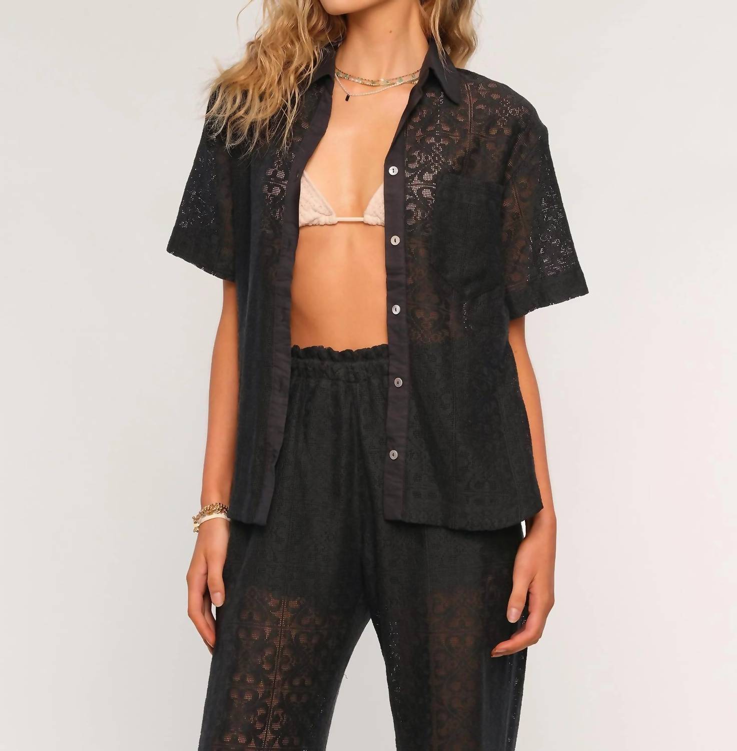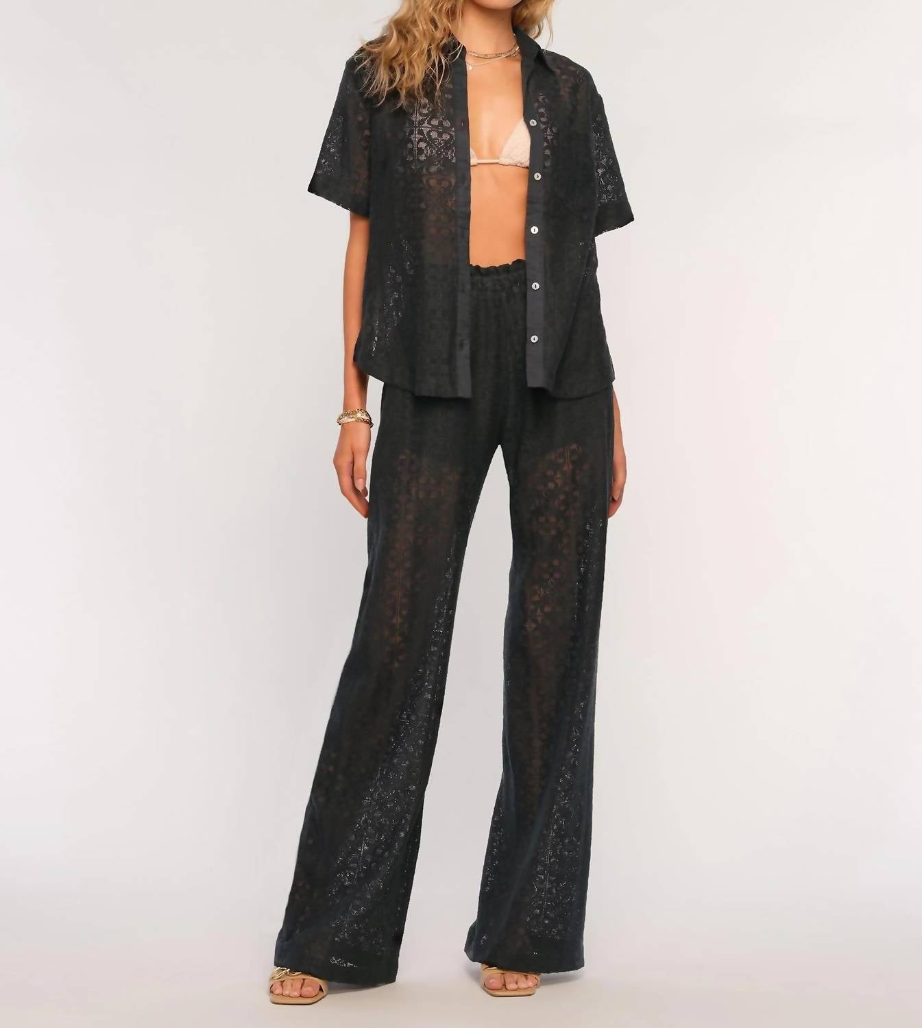 Discover the Anaheim Set by Heartloom, an ideal choice for sun-drenched days. This women's loungewear set is crafted from a cool, textured lace, blending 50% nylon, 30% cotton, and 20% polyester. The relaxed fit short sleeve top features a button-down closure while the bottoms boast a straight leg, elastic waist, pull-on design. Top length measures 24.5", while pant has an inseam of 31", making it perfect for beach days or casual outings, and easy care with hand washing and line drying suggested.