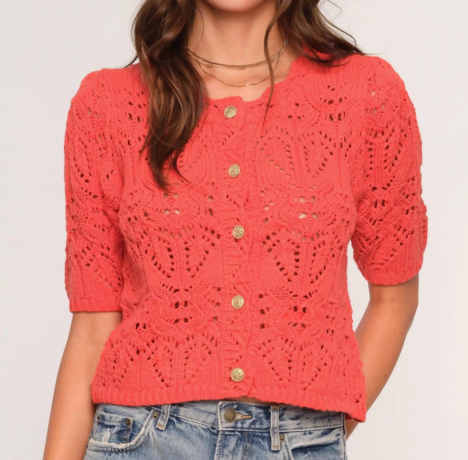 This cardigan will be a sweater-rotation favorite. Introducing the Letitia Cardi by Heartloom, a perfect blend of style and comfort in a vibrant Flame hue. This women's cardigan features short sleeves and a textured pointelle stitch for a vintage touch, complemented by a scalloped crewneck. Crafted from a soft cotton blend, it measures 18.5 inches from the high point of the shoulder, offering a relaxed fit that's ideal for a vacation look. Closure: Button closure. Composition: 60% Cotton, 40% Acrylic.