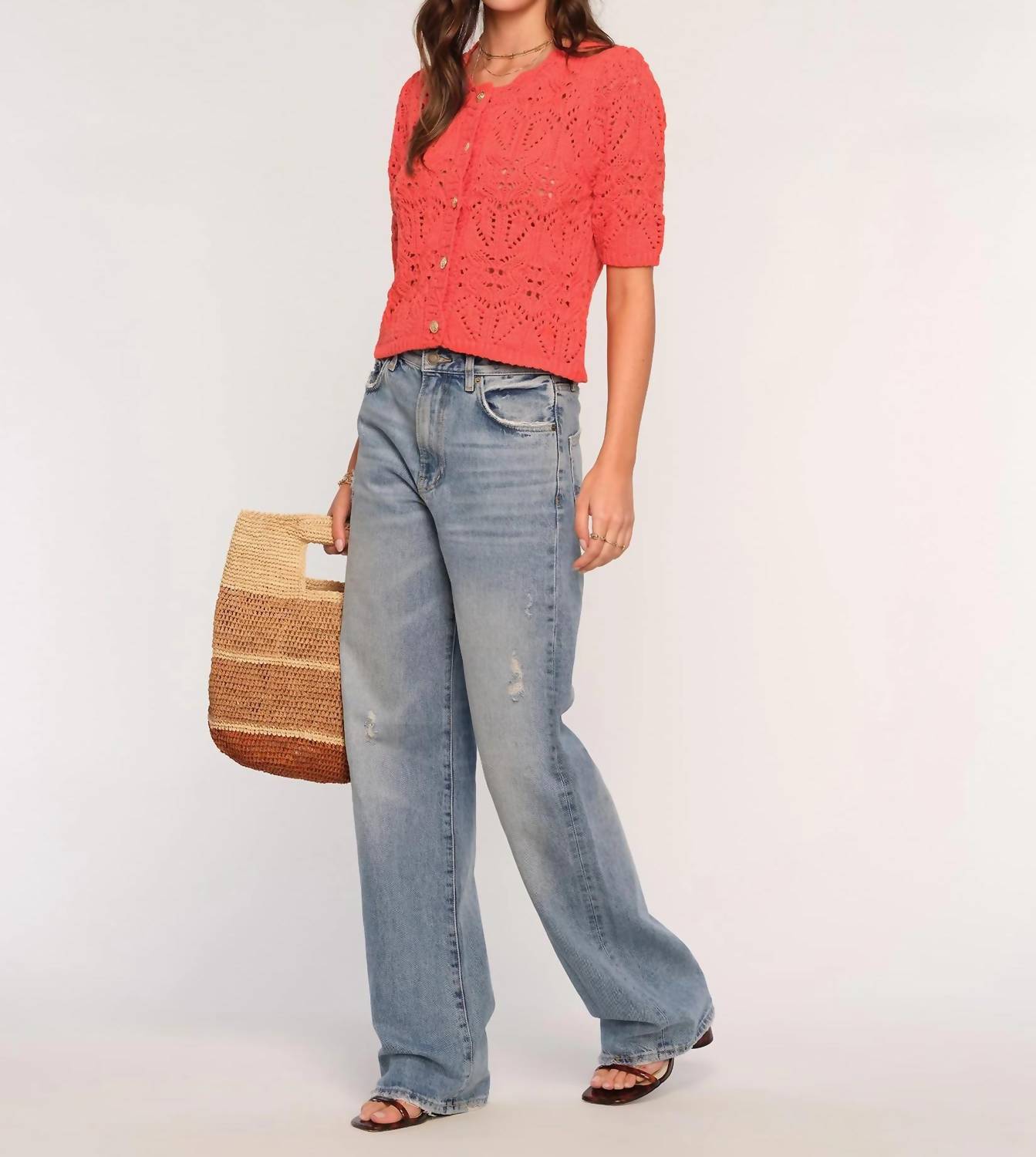 Introducing the Letitia Cardi by Heartloom, a perfect blend of style and comfort in a vibrant Flame hue. This women's cardigan features short sleeves and a textured pointelle stitch for a vintage touch, complemented by a scalloped crewneck. Crafted from a soft cotton blend, it measures 18.5 inches from the high point of the shoulder, offering a relaxed fit that's ideal for a vacation look. Closure: Button closure. Composition: 60% Cotton, 40% Acrylic.