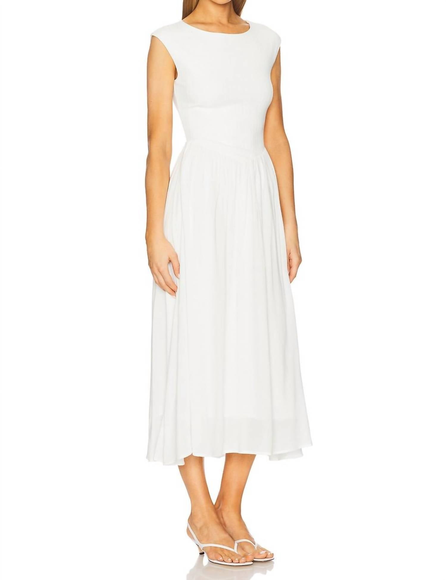A midi dress so versatile, your options for wearing it are endless. Discover effortless elegance with the Heartloom Mora Dress in classic white, an ideal choice for your next vacation. This dress showcases cap sleeves and a crewneck, combining a rib-knit bodice with a fully lined woven skirt in a slim-fitting A-line silhouette. Crafted from 96% rayon and 4% spandex for a soft touch, it extends to a maxi length of 51" from the high point of the shoulder. Made in China with a convenient pull-on closure, remember to hand wash to preserve its minimalist charm.