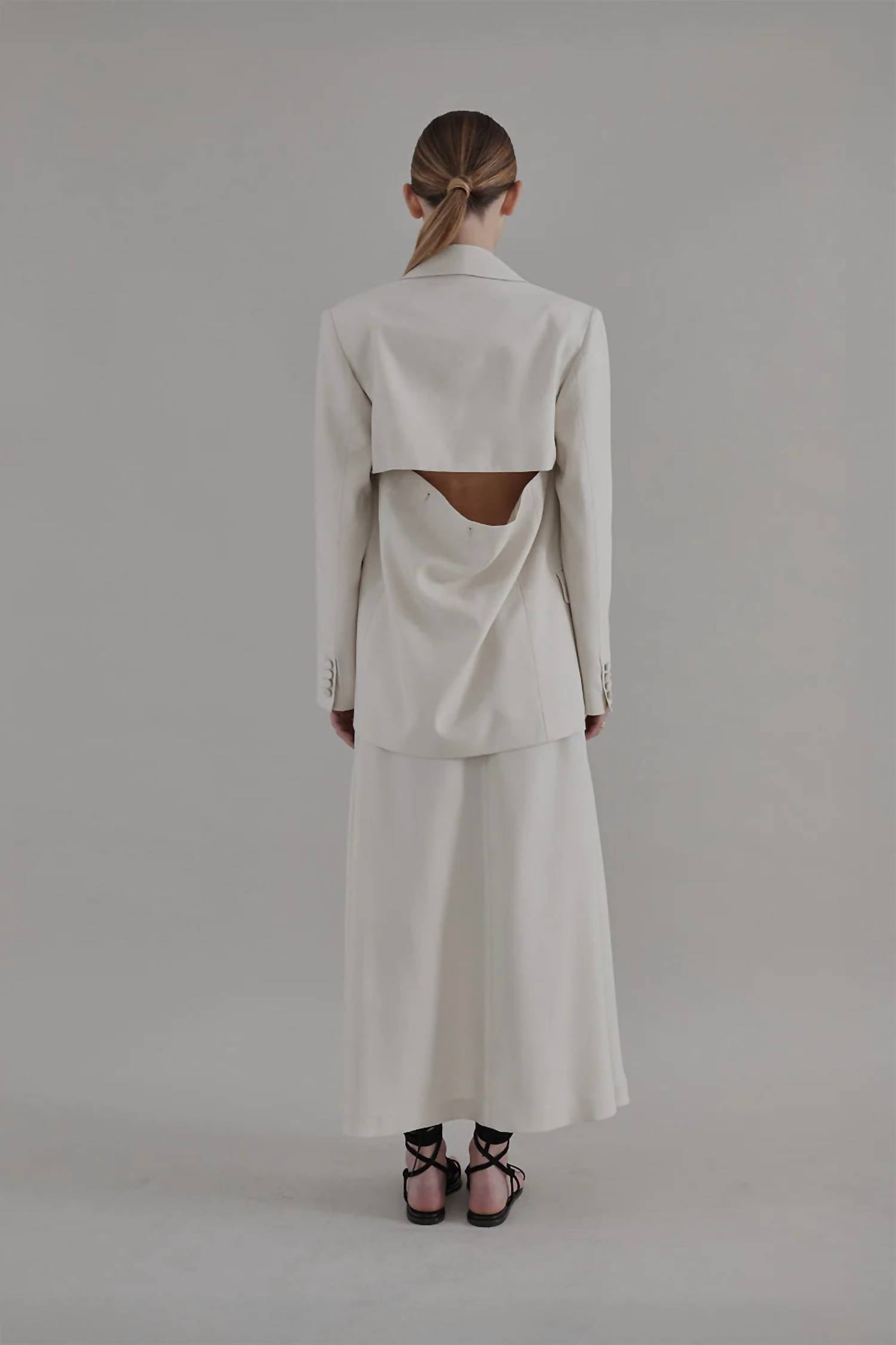 Elevate your wardrobe with Heirlome's Costanza Blazer, an exquisite piece crafted from Italian silk twill. This long sleeve blazer, in a sophisticated Oyster hue, features a unique back button-up cutout, allowing you to seamlessly switch between elegant and daring looks. Proudly made in the USA, it boasts fabric-covered buttons and a wide peak lapel, complemented by light shoulder pads for a refined silhouette. With a button closure and practical pockets, this blazer is perfect for a dinner party or any workwear occasion. Composition: 100% Silk. Care: Dry clean only.