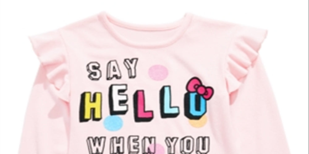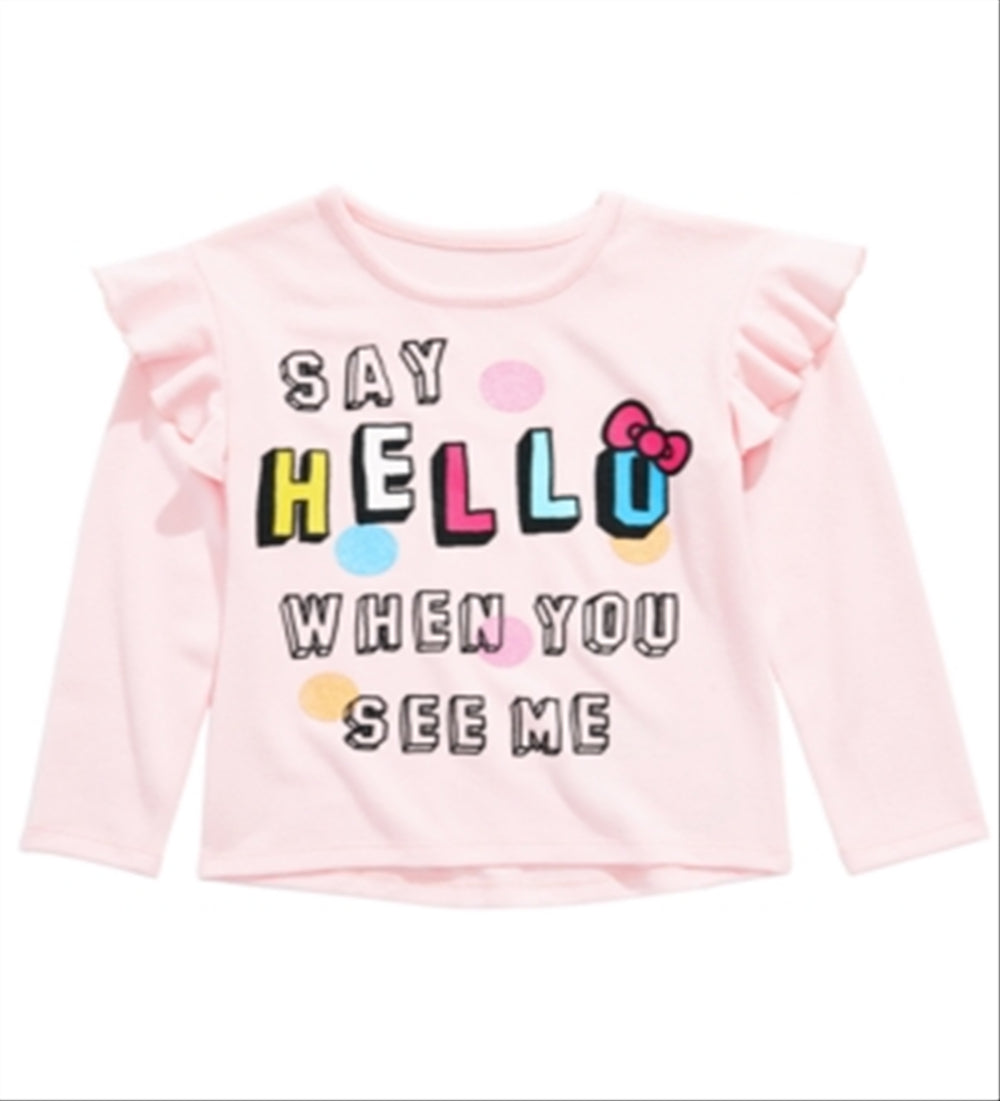 Olá! Esta blusa superfofa da Hello Kitty tem babados em cada ombro e uma estampa divertida.