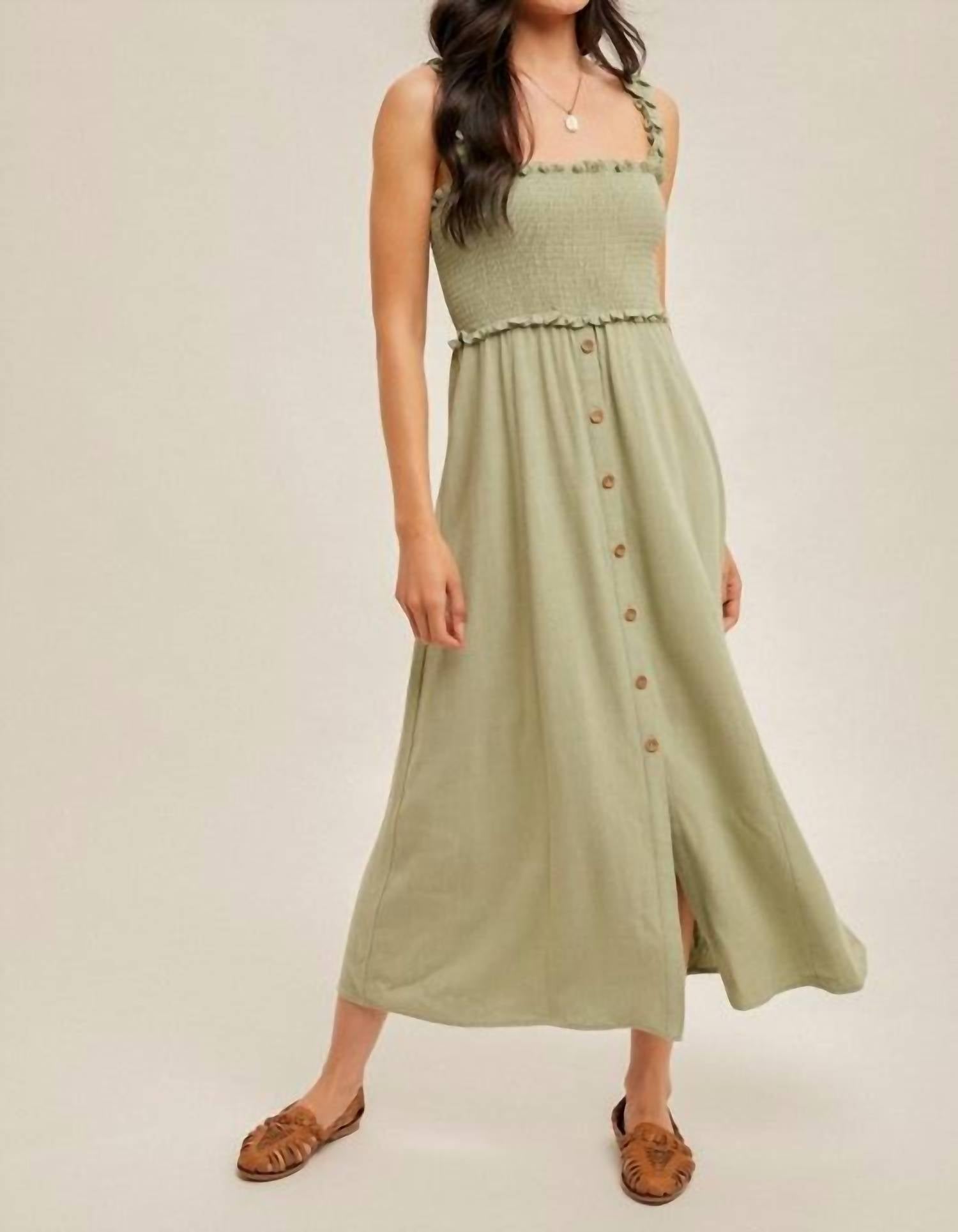 Pair with your favorite sandals for an effortlessly chic look. Discover the Halle Smocked Top Midi Dress by Hem & Thread, an elegant piece for your spring wardrobe in a captivating Apple Jade. Designed with a sleeveless, smocked top featuring ruffle straps and comprised of a 70% Viscose and 30% Linen blend, this dress offers both comfort and style. The A-line silhouette provides a flattering shape, while the pull-on closure ensures easy wear for any dinner party or New Year's Eve celebration. Care for it effortlessly with machine washing, and enjoy the dress's adaptability, with dimensions of 50.5" length in size M and a bust that stretches beyond 26".