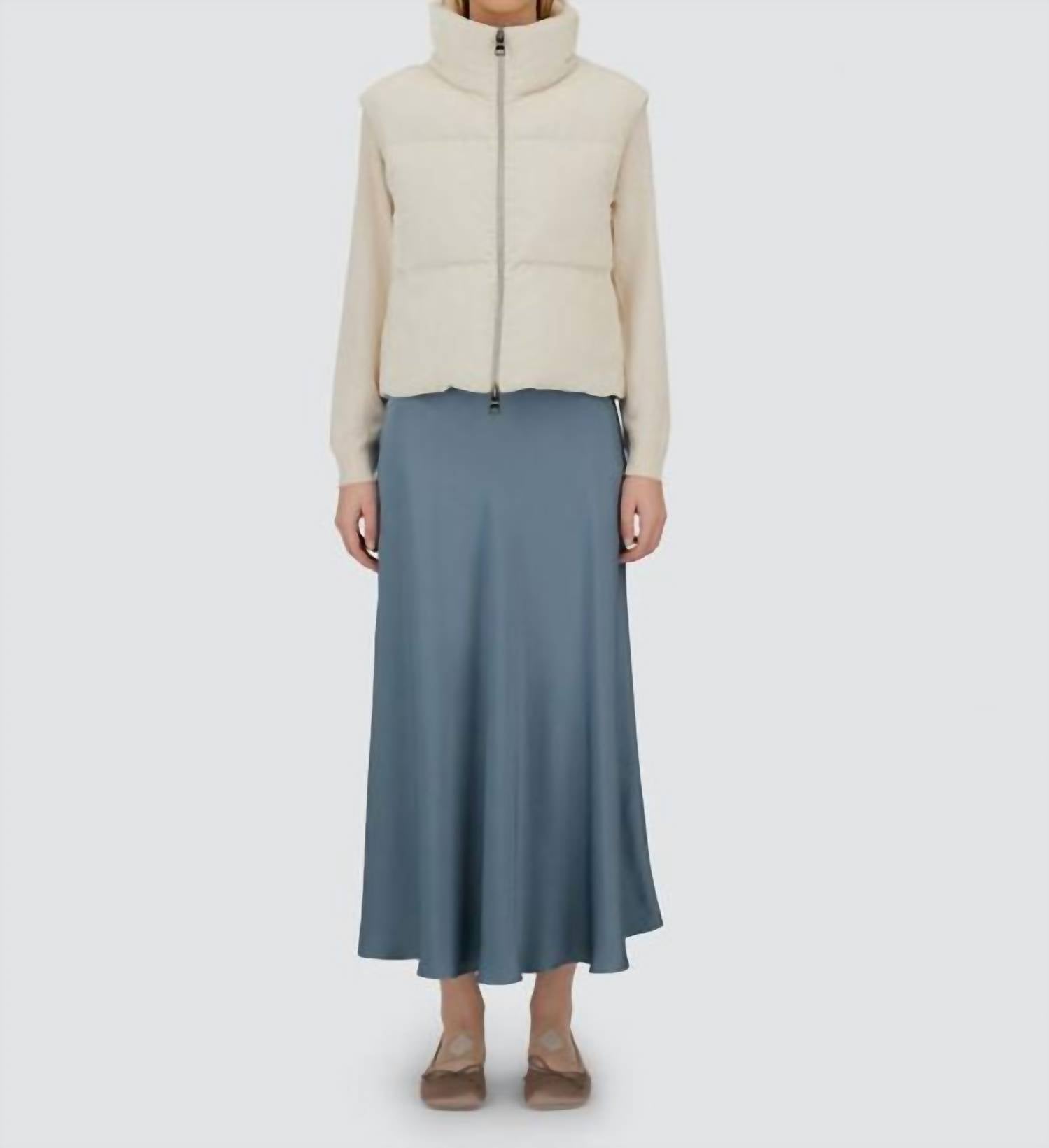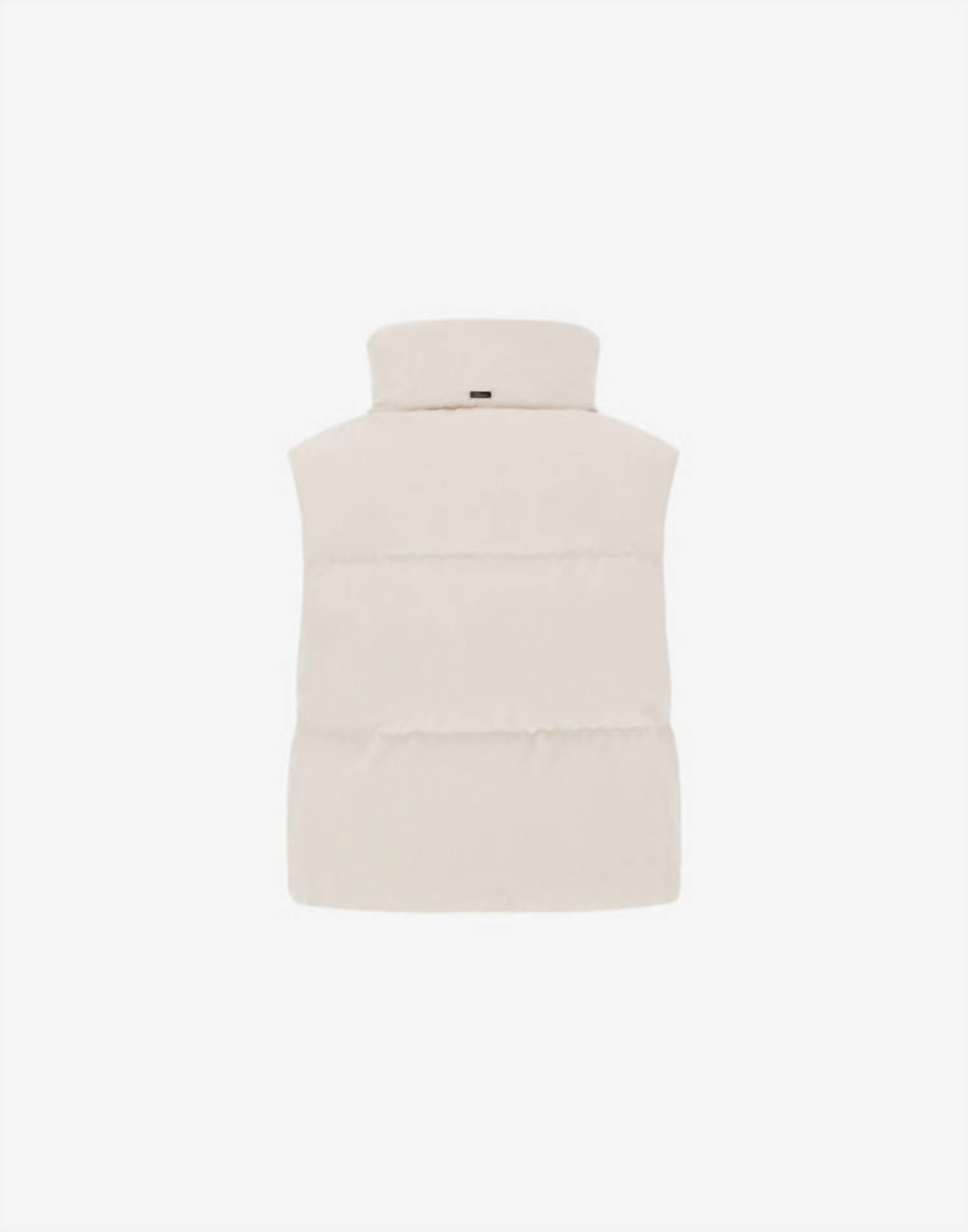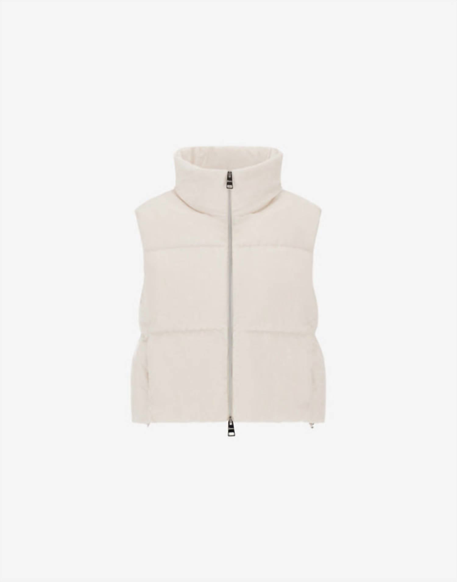 You'll be reaching for this puffer jacket all season long. Elevate your winter wardrobe with the Shiny Corduroy Vest by Herno, a luxurious addition in elegant champagne white. This tactile piece offers the relaxed elegance of a long-sleeve design, featuring a viscose-blend fabric enhanced with sparkling lurex. The vest, made in Italy, showcases feather padding, a high collar, and the convenience of a two-way zip closure, while side pockets add functionality. This uniquely textured puff vest is perfect for vacation or seasonal occasions, adding a touch of monochrome sophistication to your look.