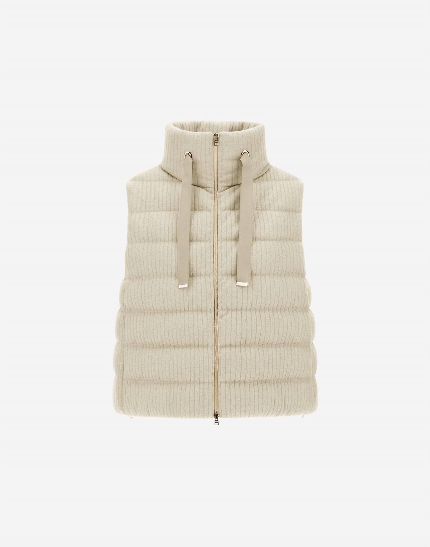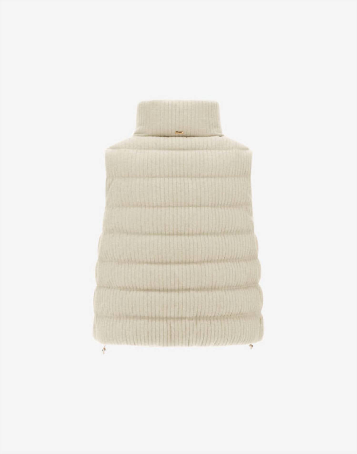 A vest so versatile you can mix and match it with almost any outfit and it will feel brand new every time. The Herno Shiny Ribbed Knit Vest in Chantilly 1985 is a sophisticated addition to your winter wardrobe, featuring a sleeveless design crafted from a viscose blend. Made in Italy, this vest combines 52% polyester, 28% viscose/rayon, 10% metallised fibers, and 10% polyamide/nylon, enhancing its textured, refined appearance with lurex-yarn inserts. Closure is secured with a practical two-way zip and adjustable grosgrain drawstring at the high collar. Whether you're dressing for a winter vacation or Christmas occasion, this vest offers both elegance and versatility with practical pockets seamlessly integrated.