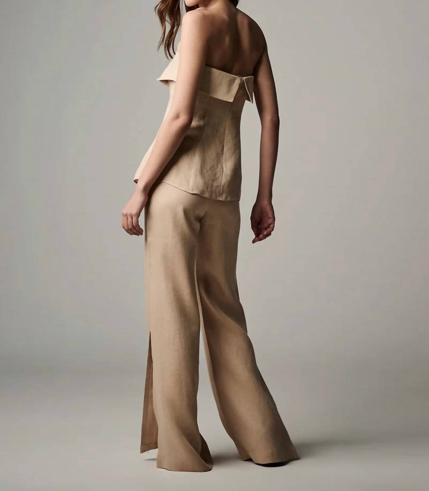Introducing the Addison Off-shoulder Top by Hevron, a sophisticated piece for any summer wardrobe. This strapless top in a solid wheat hue is crafted from 100% soft-to-touch hemp and features a flattering peplum style overlay. Designed with a low-waisted hemline and a zip closure, it offers a sleek and modern silhouette. Care is simple with machine wash and line dry instructions, ensuring easy upkeep for summer outings.