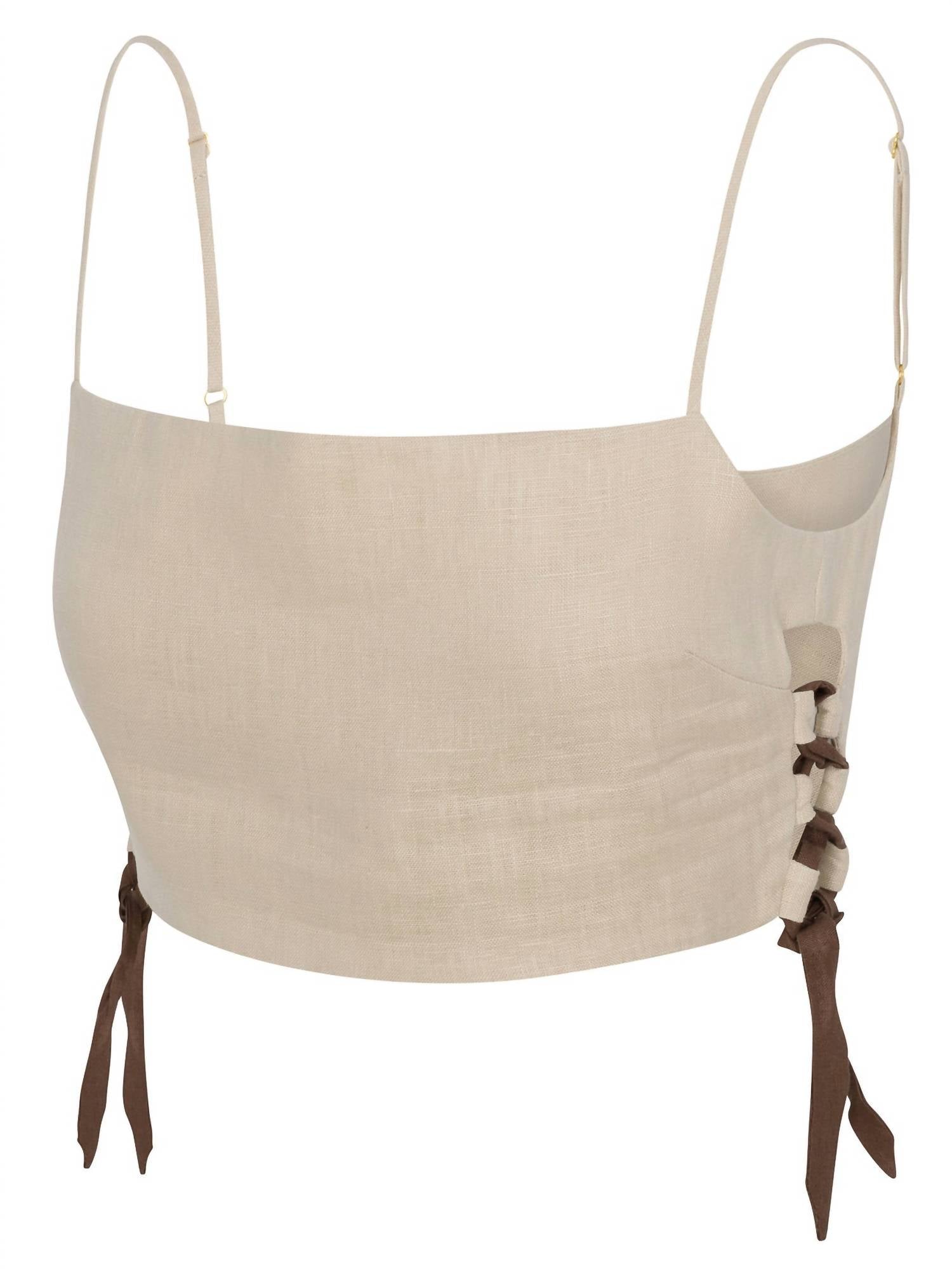 Eleve seu guarda-roupa de verão com um toque boho chic. Top cropped texturizado em uma linda cor areia, com alças finas, decote quadrado estiloso e fecho prático com amarração lateral em chocolate. Confeccionado com maestria em 100% linho. Oferece conforto e estilo para o seu próximo dia de praia. Lavar somente à mão.