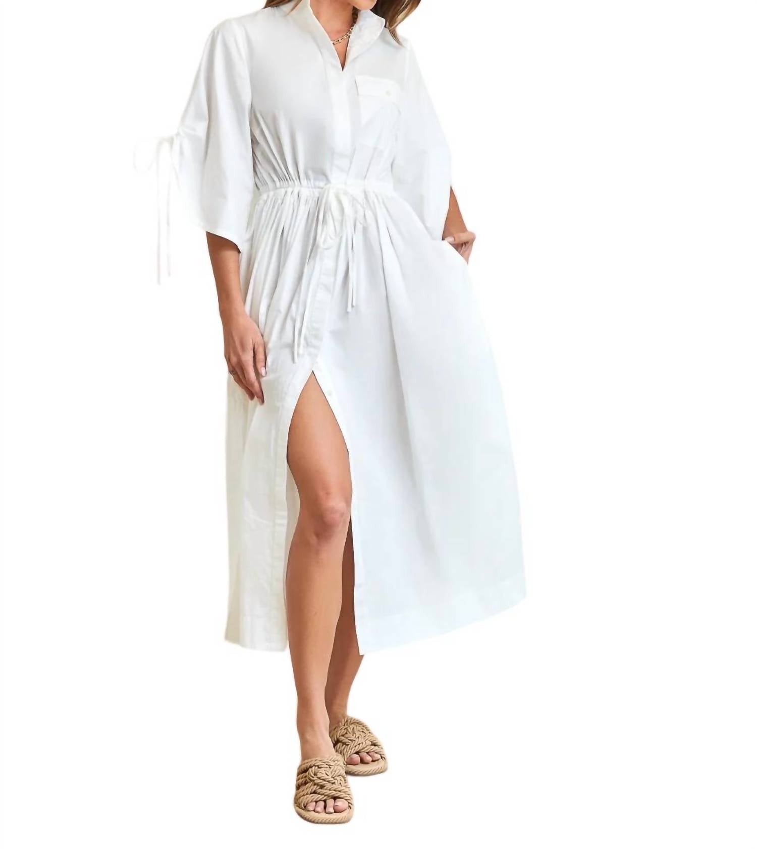 Um vestido midi tão versátil que suas opções de uso são infinitas. Este vestido midi é a sua escolha para qualquer ocasião, equilibrando um visual casual com um toque de sofisticação. O cós ajustável com amarração permite que você ajuste a silhueta, personalizando o caimento para valorizar seu corpo, enquanto as mangas três quartos apresentam amarrações que adicionam um toque delicado e pessoal. Um fecho de botão adorna a frente, levando perfeitamente aos botões laterais da saia, que podem ser abertos para criar um look mais relaxado e fluido. Popeline 100% algodão.