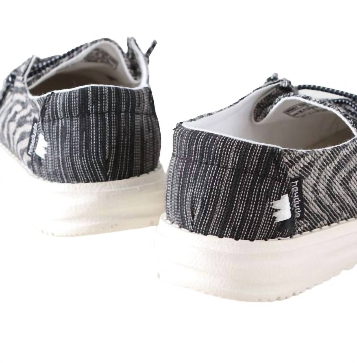 The Hey Dude Youth Wendy Woven Zebra Terra Stripe combines the classic Wendy style with a playful natural zebra print. These shoes are both cute and practical, featuring no-tie elastic laces, an aerated memory foam insole, and an ultra-lightweight outsole. Made with a cotton canvas upper, they are also machine washable.