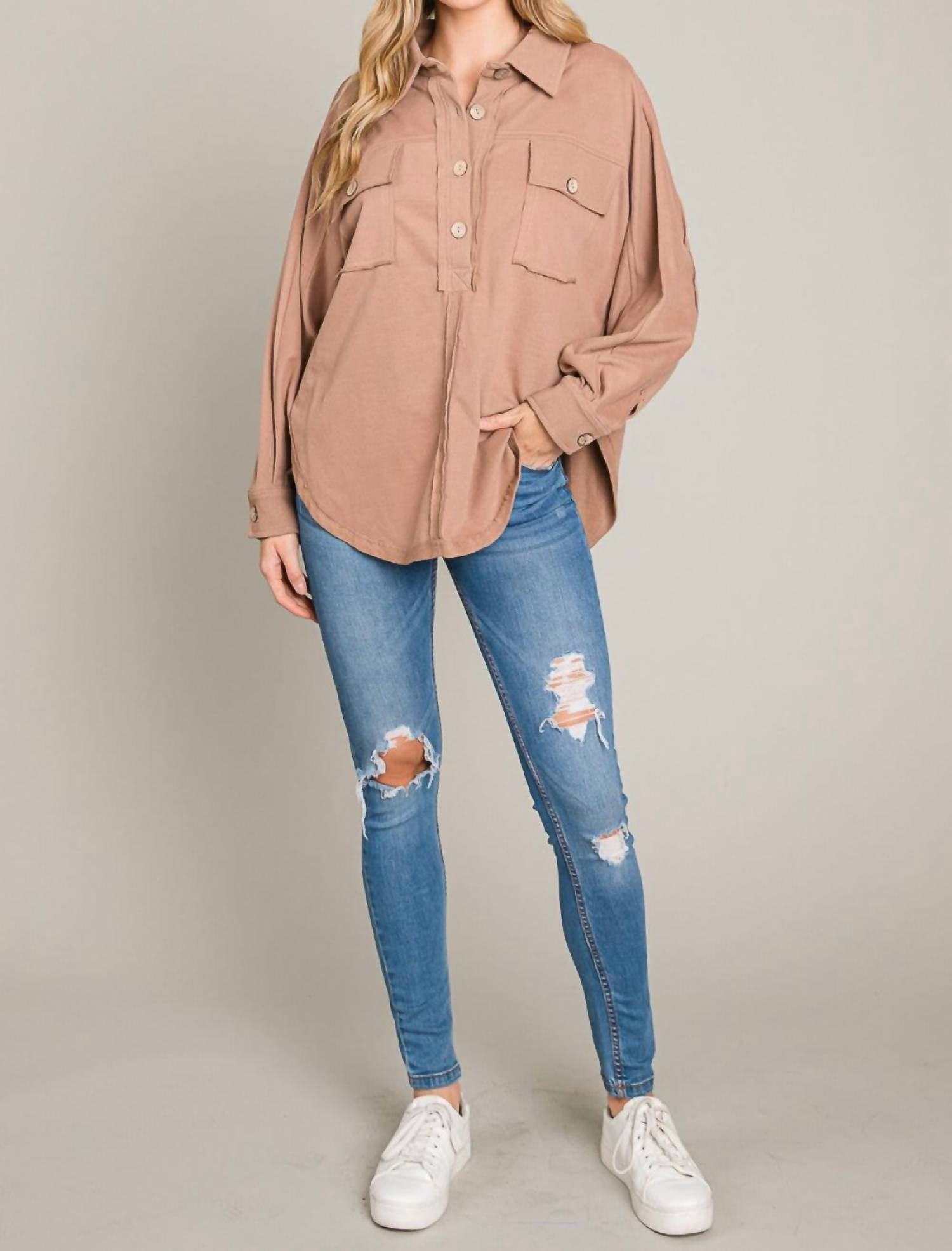 A classic button down shirt that will never go out of style. Embrace relaxed elegance with the Feels So Right Pullover Top by Heyson, a minimalist piece in solid beige designed for versatile wear. This women's pullover features long sleeves, crafted from a cozy blend of 60% cotton and 40% polyester. Closure: Button closure with a classic collar neckline. Ideal for summer vacays, its oversized fit and soft, lightweight French terry material ensure you stay comfortably chic.