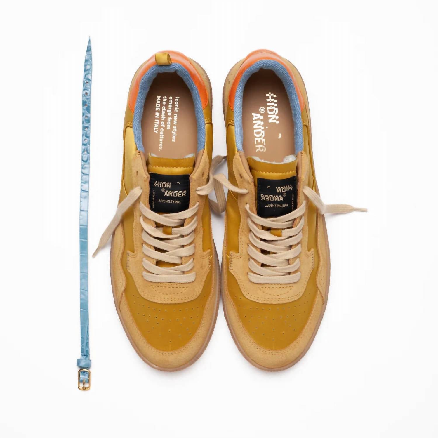 Meet the Women's Mega T Sneakers by Hidnander, an Italian-made masterpiece merging tennis inspiration and bold fashion statements. These women's athleisure sneakers showcase a trendy yellow hue with a suede and leather upper complemented by a retro rubber low-profile outsole. Designed with an effortlessly chic round toe and flat heel, they are perfect for summer game days. Made entirely in Italy, they embody a sustainable approach to modern style.