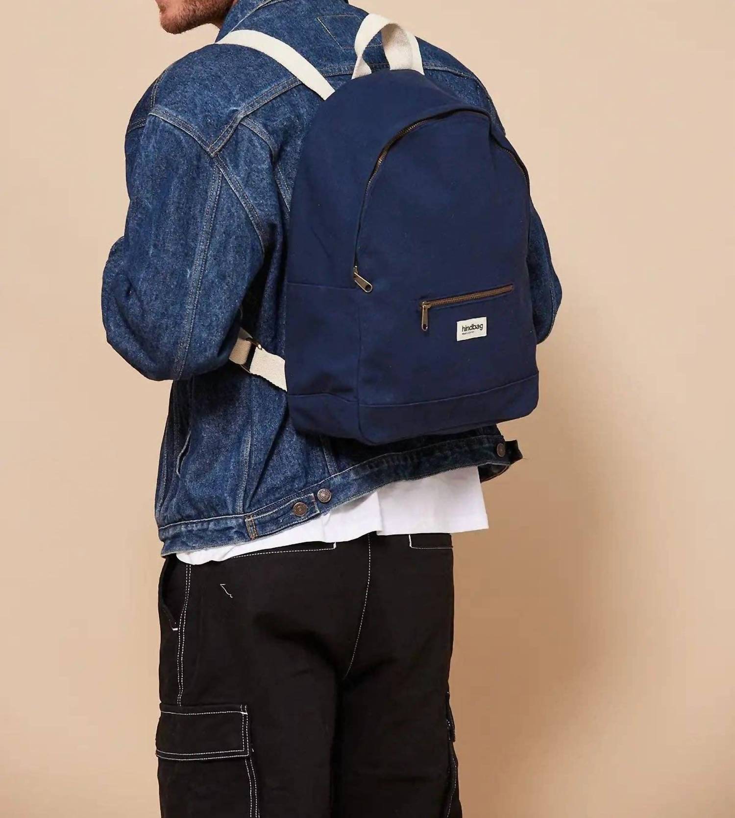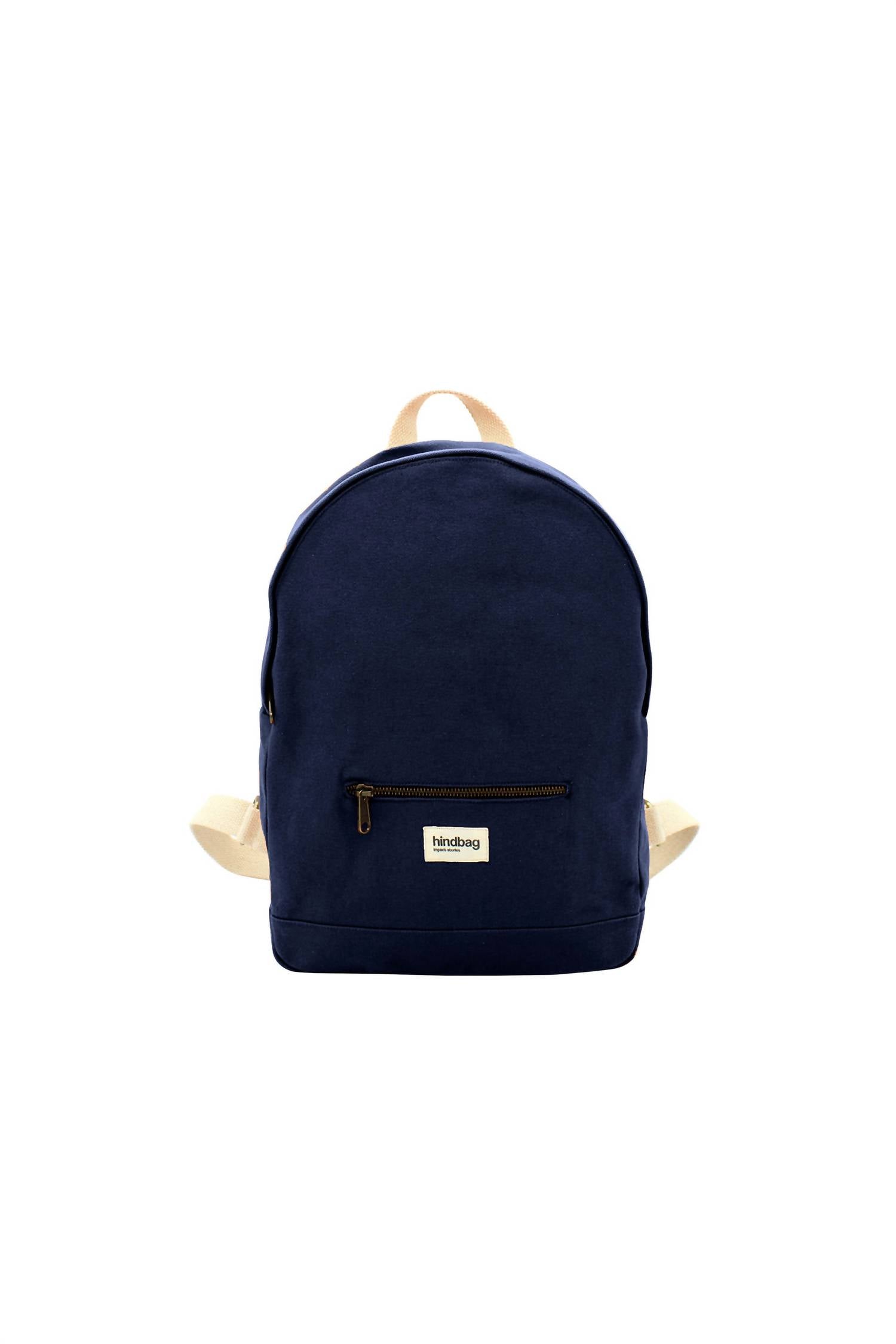 Introducing the Men's Lucien Backpack by Hindbag, a navy accessory that captures the essence of timeless design with its classic rounded shape. Ideal for both students and adults, this backpack is crafted from thick and resistant GOTS certified organic cotton. It features adjustable handles and an inner compartment with a blockprint pattern, perfect for securely carrying a computer. With dimensions of H 44 x W 29 x D 12 cm, it includes an external zipped patch pocket for additional storage and is made in collaboration with Hindbag’s NGO partner, SSMI, in India.