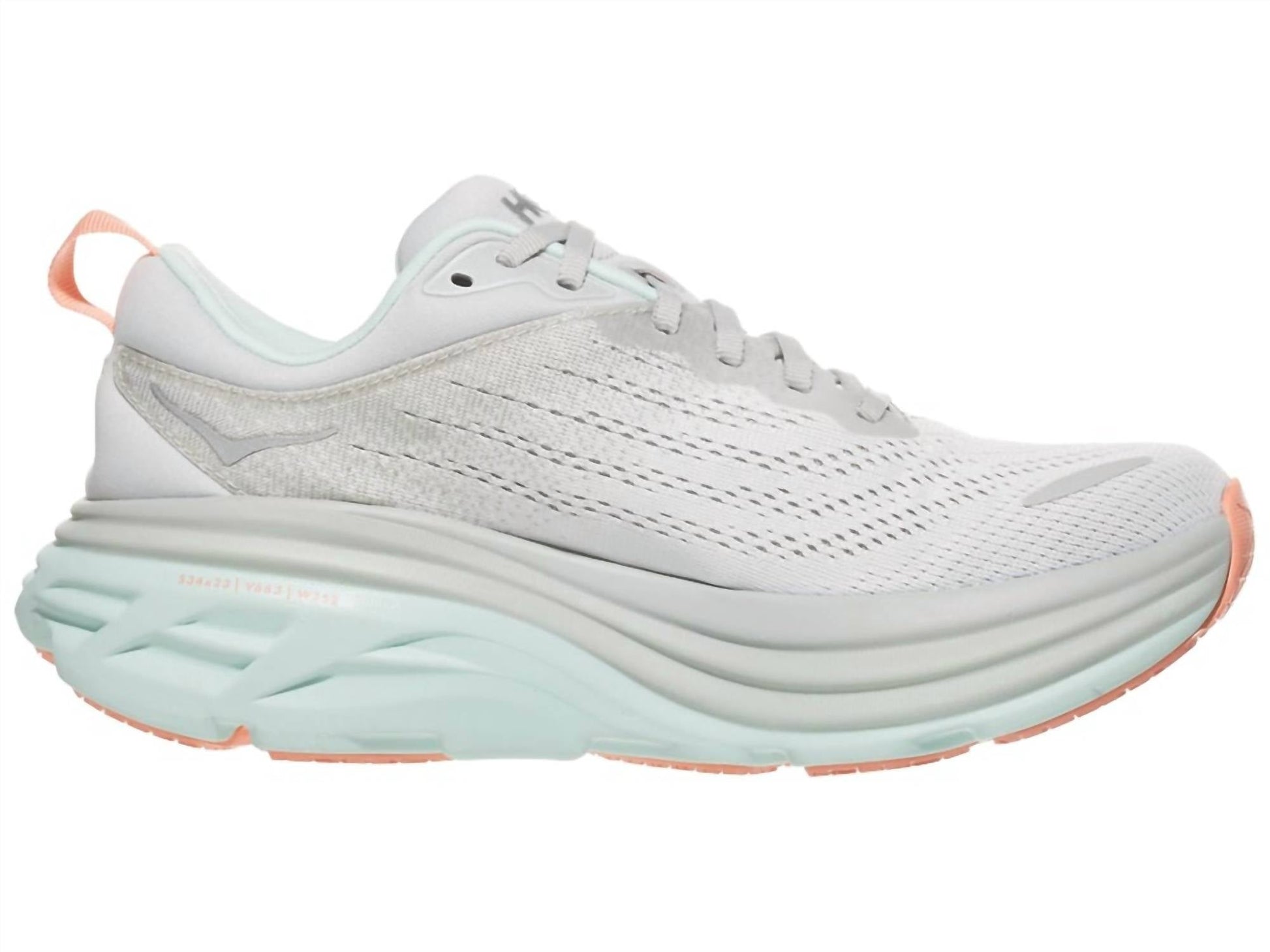 Introducing the Women Bondi 8 Running Shoes by Hoka, perfect for your athletic pursuits. Available in the eye-catching Stardust/Aqua Breeze color, these shoes feature a round toe shape to ensure comfort and functionality for women athletes. Designed with a focus on performance, these shoes are an essential addition to your activewear collection. Ideal for adults seeking style and comfort in every stride.