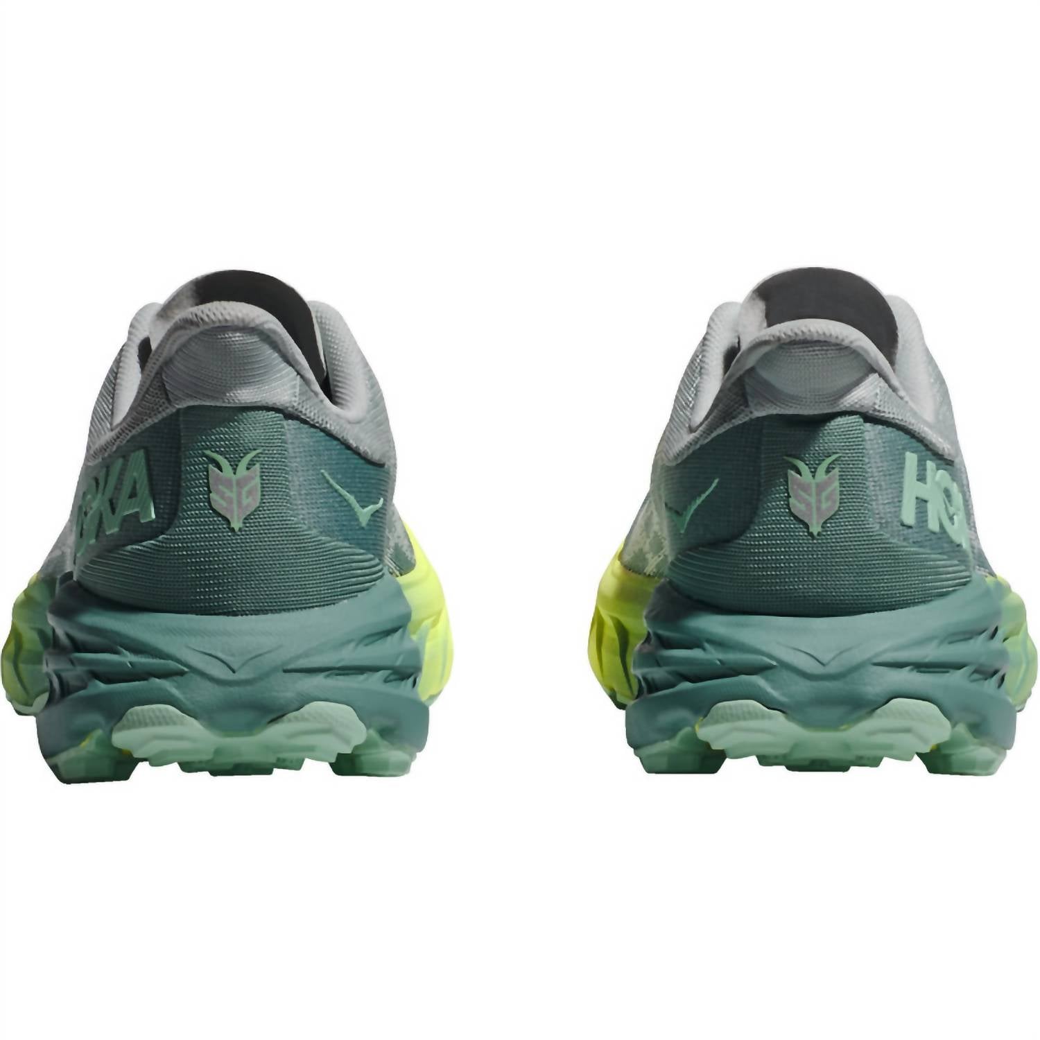 Treine com estilo com estes adoráveis tênis esportivos. O Hoka Speedgoat 5 (modelo 1123158-MTLL) é um tênis para corrida e caminhada em trilhas com cabedal em malha jacquard de camada dupla, biqueira protetora e entressola de espuma moldada por compressão com drop de 4 mm do calcanhar à ponta. Inclui Vibram Megagrip com Traction Lug para aderência superior, um Meta-Rocker de estágio avançado e um padrão de 5 mm de garras. O tênis pesa 8,5 oz, tem um volume de 519 cm³ e é adequado para veganos.