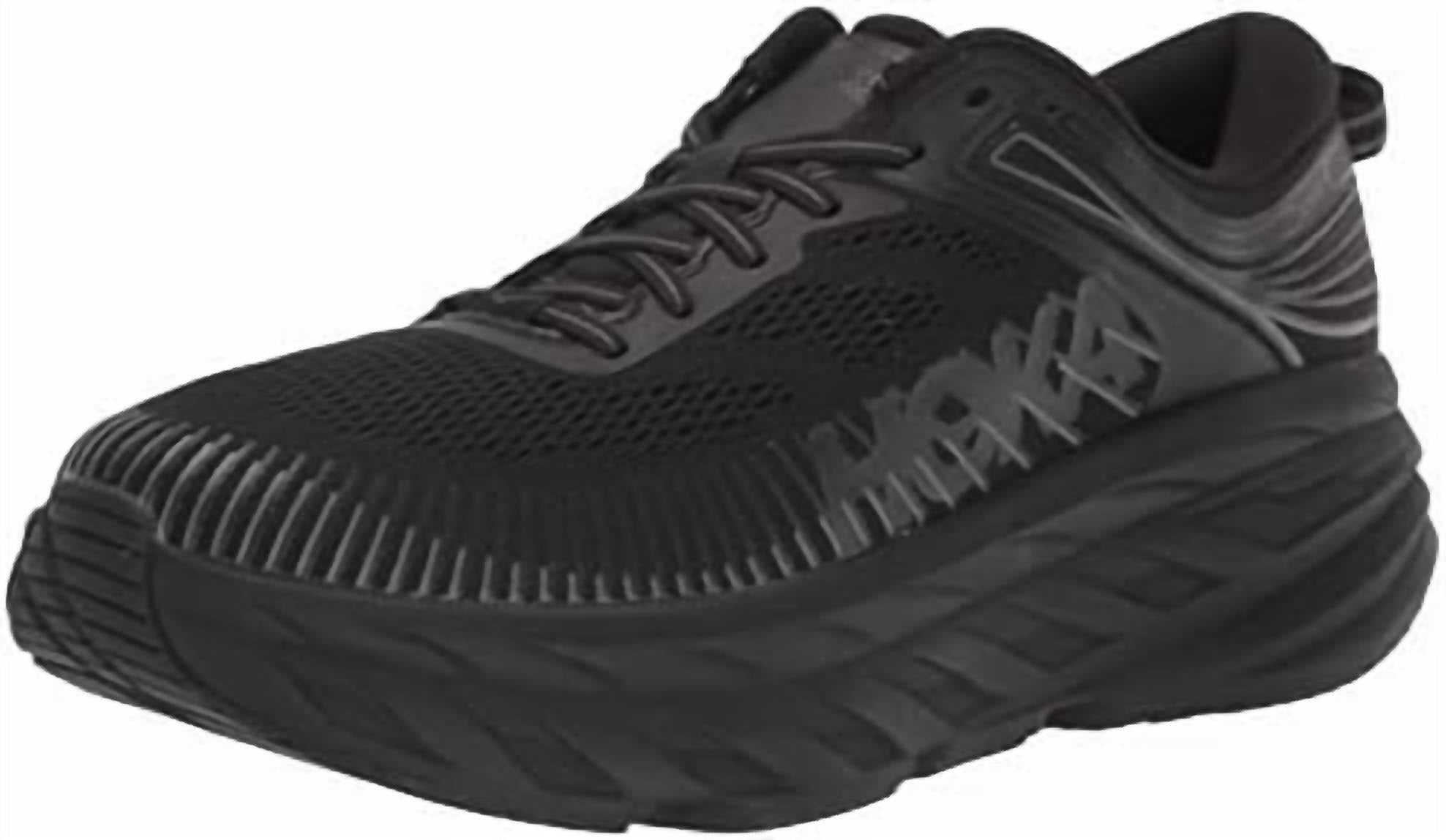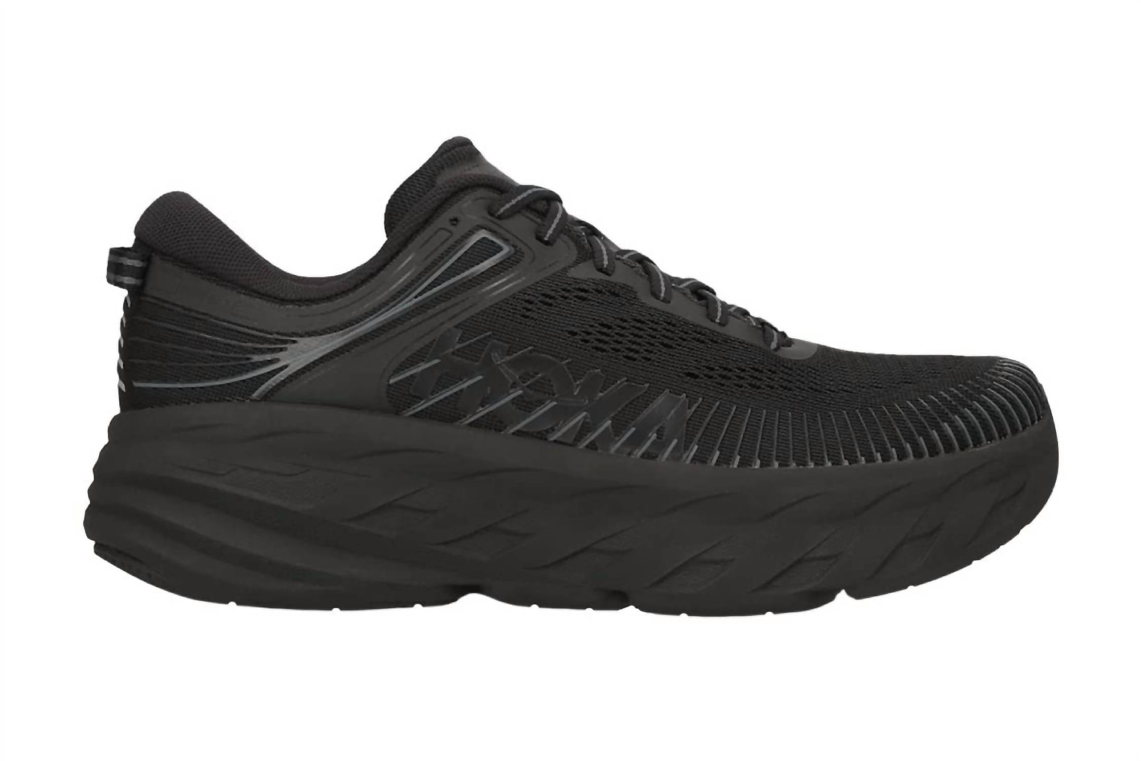 When fashion and function come together seamlessly. Step into the future of comfort with the Hoka Women's Bondi 7 Sneaker in sleek black. These running shoes feature an open-engineered mesh upper complemented by TPU overlays for enhanced midfoot support, and a memory foam collar ensuring plush ankle stability. The full-length compression-molded EVA midsole absorbs impact, while the early-stage Meta Rocker technology in the midsole facilitates fluid strides. The sneaker's beveled heel design and durable rubber outsole provide a smooth transition and increased durability, making it a perfect companion for any runner aiming to cover more miles.