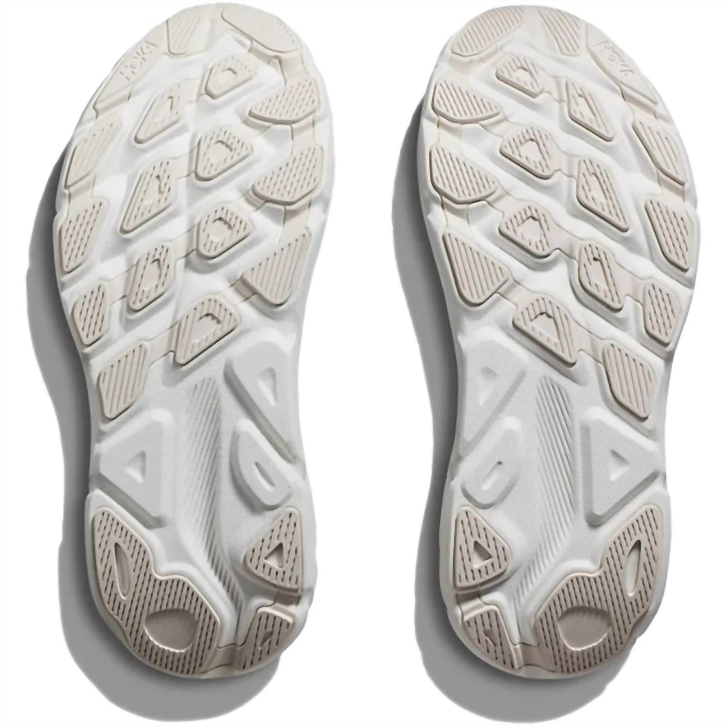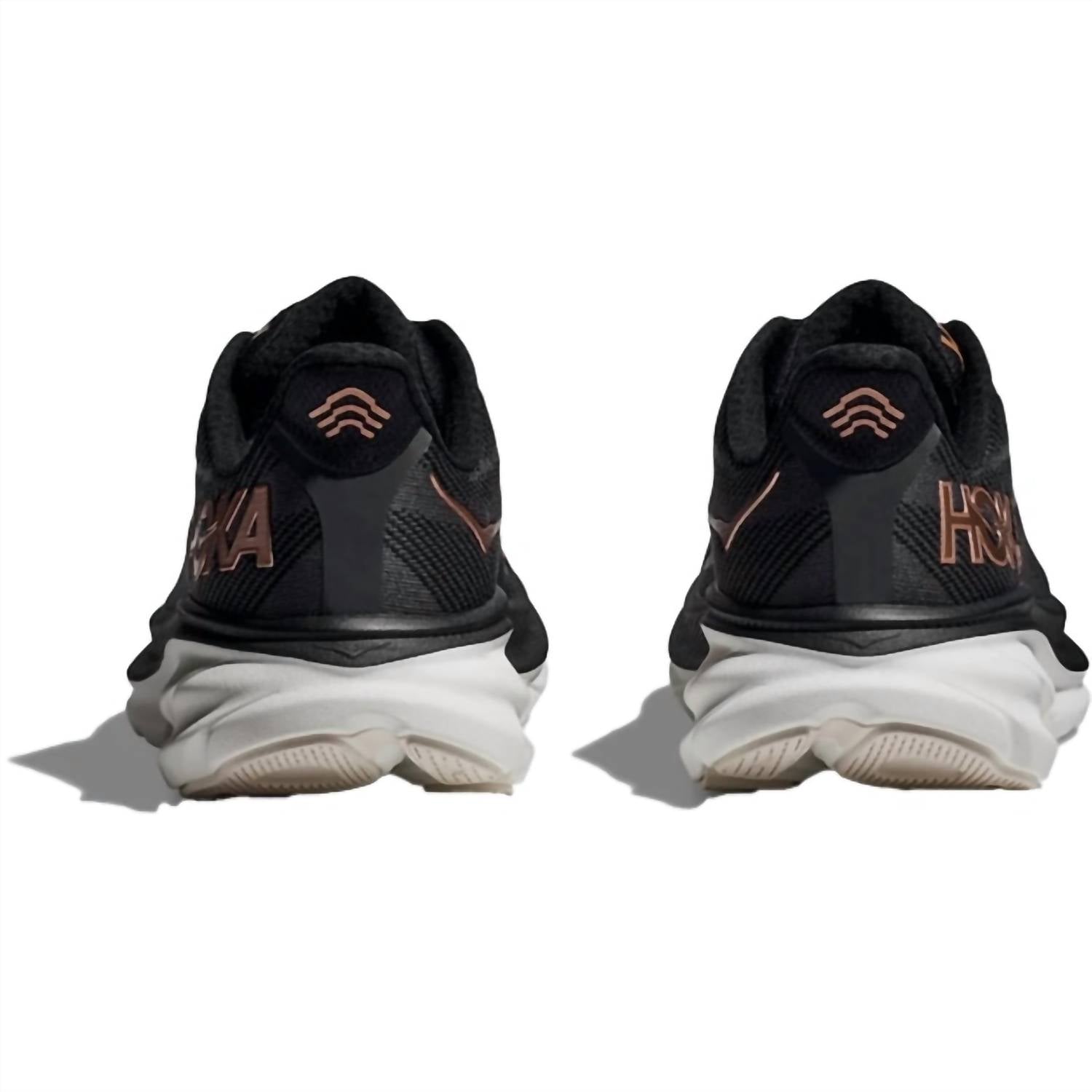 Experience the innovative Women's Clifton 9 Sneakers by Hoka, now in an elegant Black/Rose Gold for your athletic needs. This light and plush shoe, featuring a breathable engineered knit upper, is ideal for both everyday runs and walking. Crafted with a compression-molded EVA foam midsole and an early stage Meta-Rocker, it offers a responsive and cushioned ride. Designed with a round toe and wide fit, this nylon blend shoe also includes recycled mesh and polyester, making it a vegan-friendly choice.