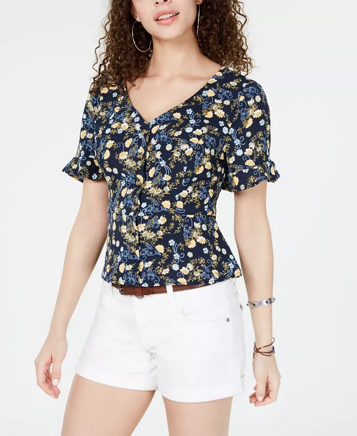 Silhueta ajustada; comprimento no quadril | Decote em V; fechos frontais com botões | Bainha peplum | Mangas curtas com babados | Poliéster/elastano | Lavável à máquina