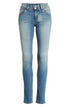 31 1/2 costura interna | 12 abertura de perna; 9 elevação frontal; 13 1/2 elevação traseira (tamanho 29) | Braguilha com zíper e fecho de dois botões | Estilo de cinco bolsos com bolsos traseiros com aba e botão | 92% algodão | 6% poliéster | 2% elastano