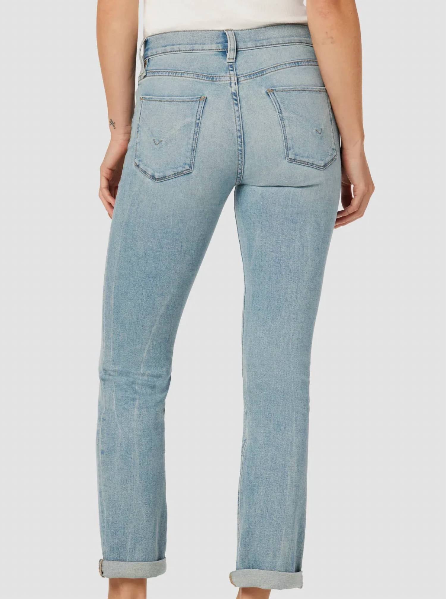 Pair these straight leg jeans with flats, sandals or even heels! You can't go wrong. Introducing Hudson's Nico Mid-Rise Straight Ankle Jean in the effortlessly chic shade of Glory Days. Crafted from premium denim, this piece is composed of 93% Cotton, 6% Elastomultiester, and 1% Elastane, offering a comfortable stretch and a flattering silhouette. Featuring a mid-rise with a 9.25" front rise, and a 28" inseam, these jeans are cropped with a rolled hem for an ideal ankle length and finished with a classic zip closure. Designed with five-pocket details and a light wash with vintage-feel fading, they’re perfect for a springtime concert. Care instructions include machine wash and tumble dry.