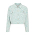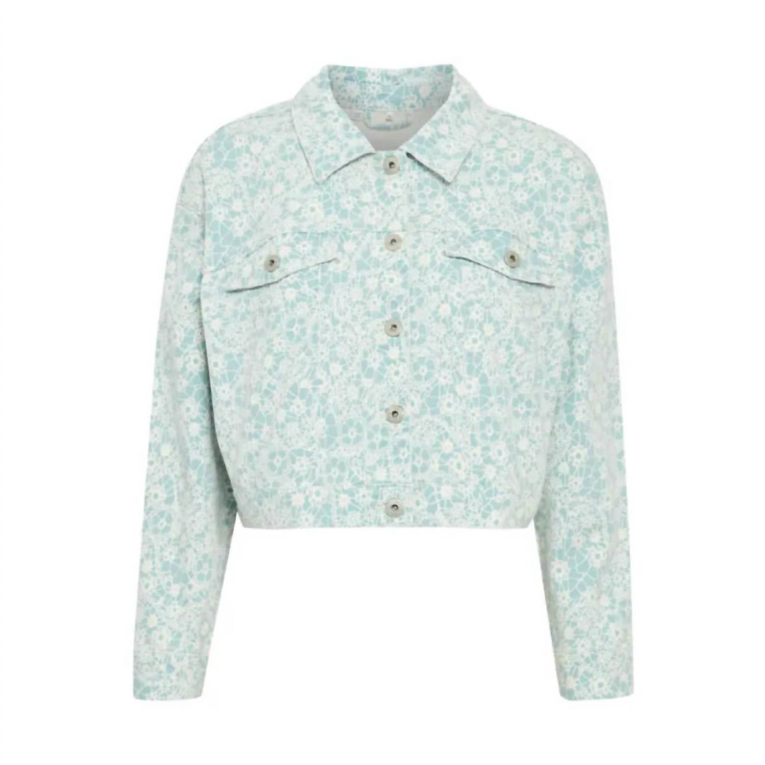 Discover the Women's Floral Print Denim Jacket by ICHI, a trendy piece in refreshing mint green. This cotton blend jacket features long sleeves and a short oversized cut, with front and back cutouts for enhanced fit and guaranteed comfort. It offers a convenient metal button closure and two flap pockets on the chest. Composition: 98% Cotton, 2% Elastane.