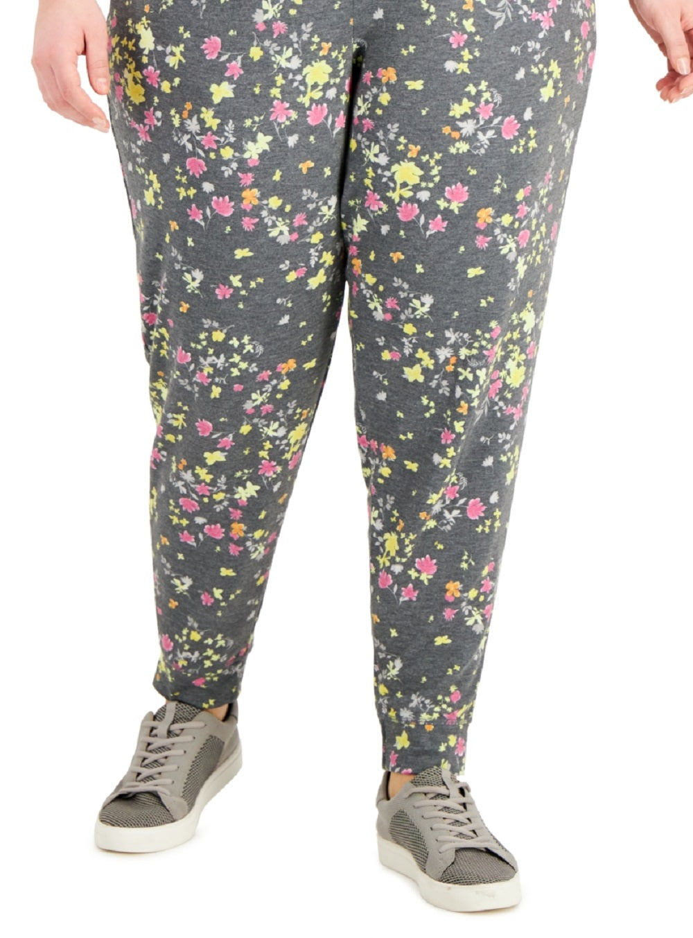 Os florais brilhantes iluminam o visual esportivo desta calça jogger plus size slim fit da ID Ideology. | Caimento justo; cós aprox.; 38,5 cm; entrepernas aprox.; 74 cm | Estilo sem cadarço; cordão no cós; bolsos laterais frontais | | Poliéster/rayon/elastano | Lavável à máquina