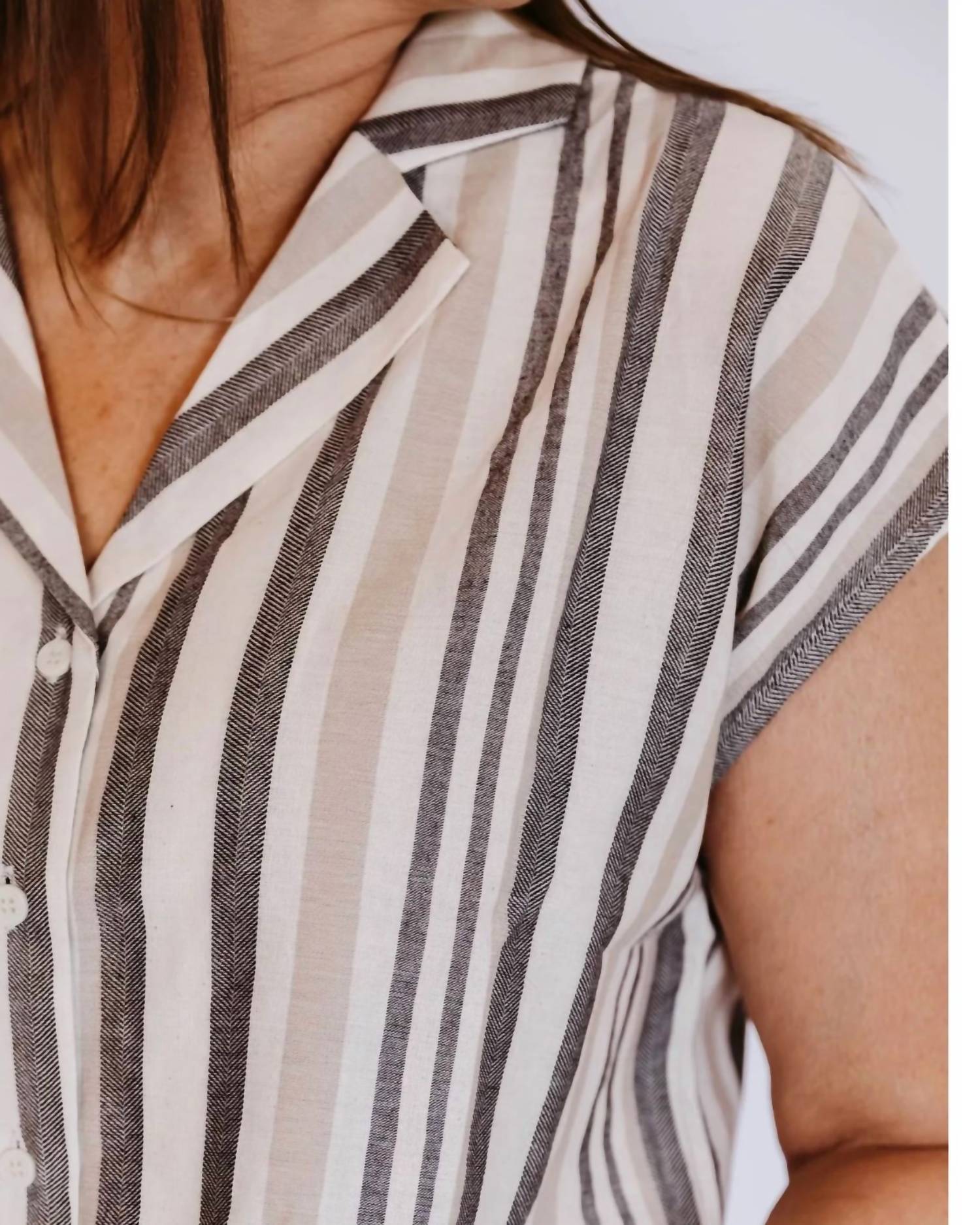 Uma blusa atemporal que nunca sai de moda. Apresentamos a blusa listrada Paige da In February, uma peça indispensável para quem busca estilo e conforto. Esta blusa de manga curta apresenta um elegante decote em V, confeccionada em uma deliciosa mistura de 50% poliéster, 35% rayon e 15% linho. Perfeitamente casual, com um padrão multilistrado natural, possui fecho de botão. Para facilitar a manutenção, basta lavar na máquina com água fria e secar em temperatura baixa. Estilizada por uma modelo de 1,70 m, que veste tamanho pequeno.