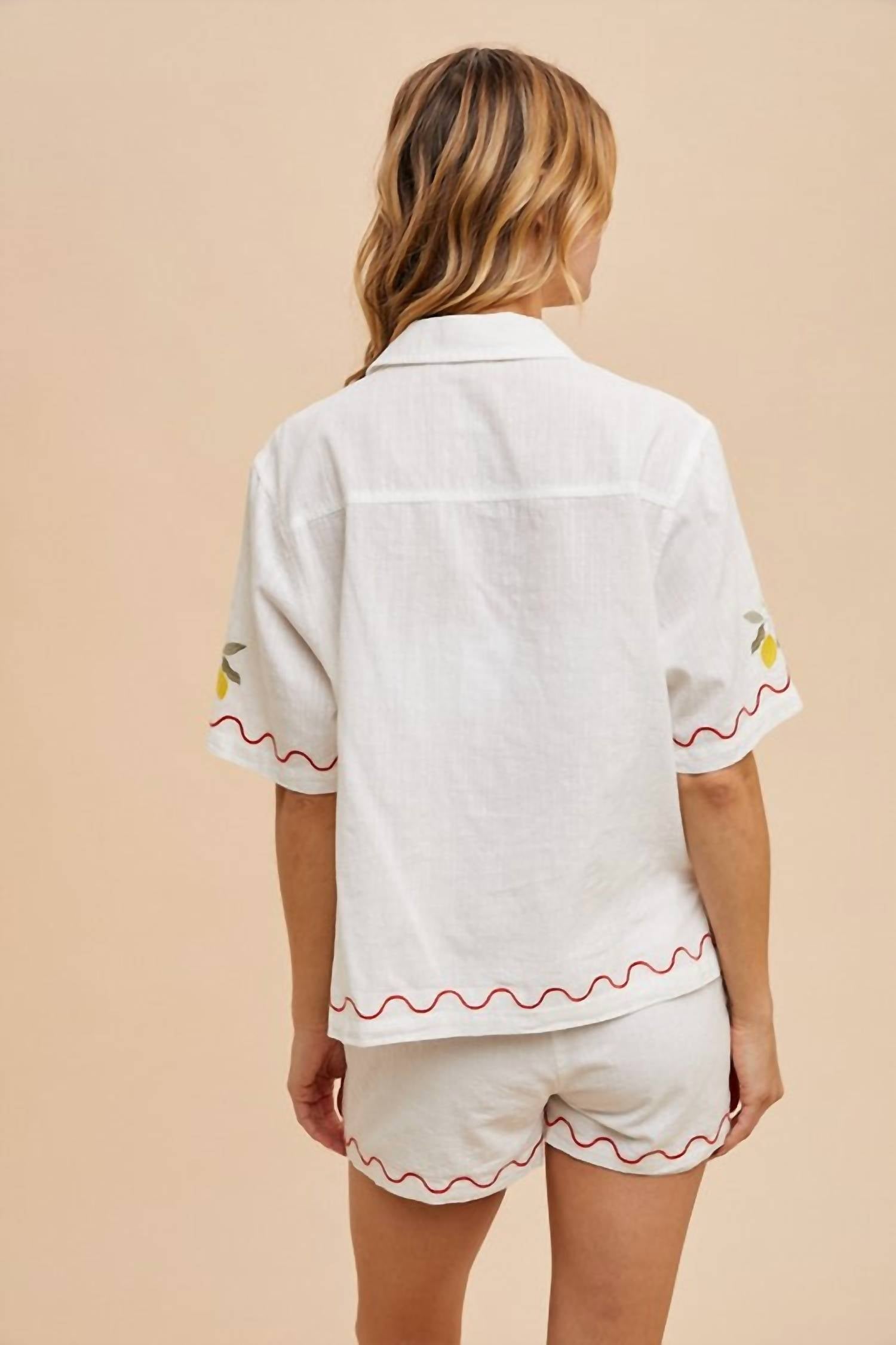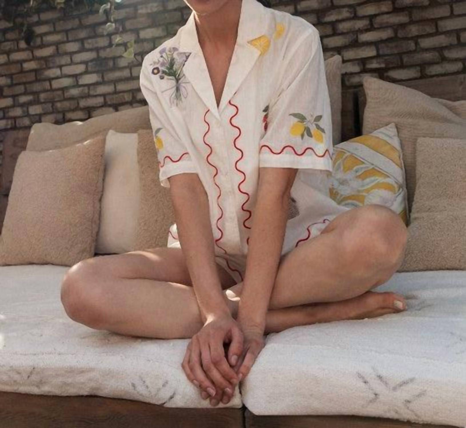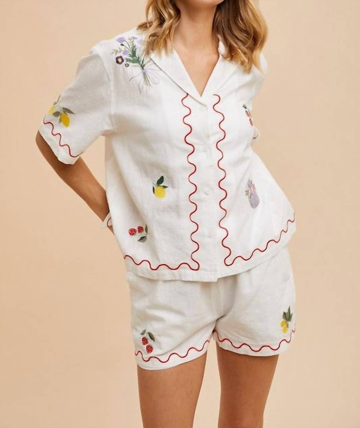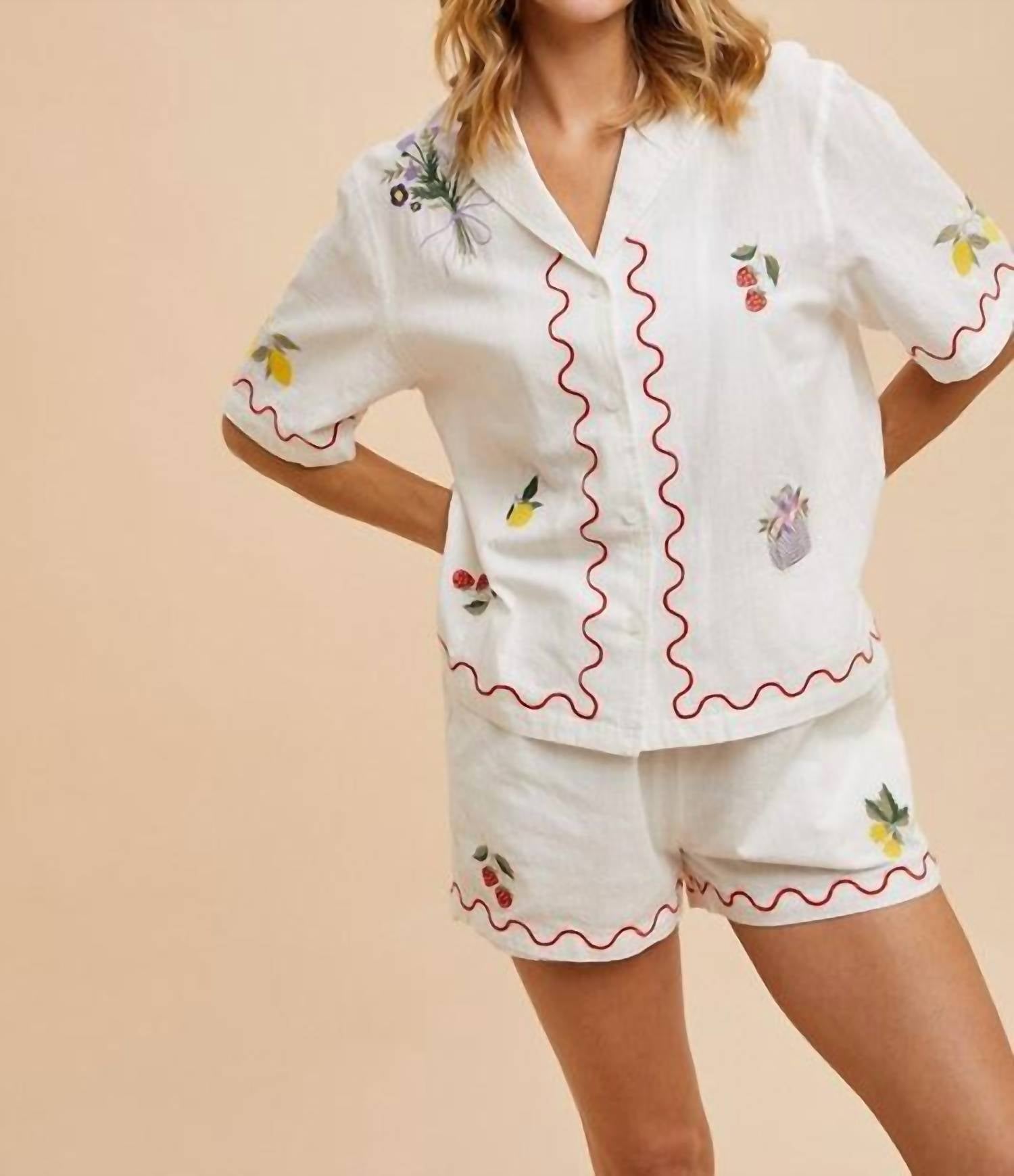 Introducing the Avery Embroidered Short Set by IN-LOOM, a chic and comfortable piece perfect for summer vacations. This stylish loungewear set in solid white features a short sleeve top with a camp collar and functional buttons. Crafted from 100% cotton with luxurious embroidered motifs, the set includes a slightly cropped top and bottoms with an elastic waistband and side pockets for added convenience. Ideal for relaxing in style, it's your go-to for a touch of boho chic elegance.
