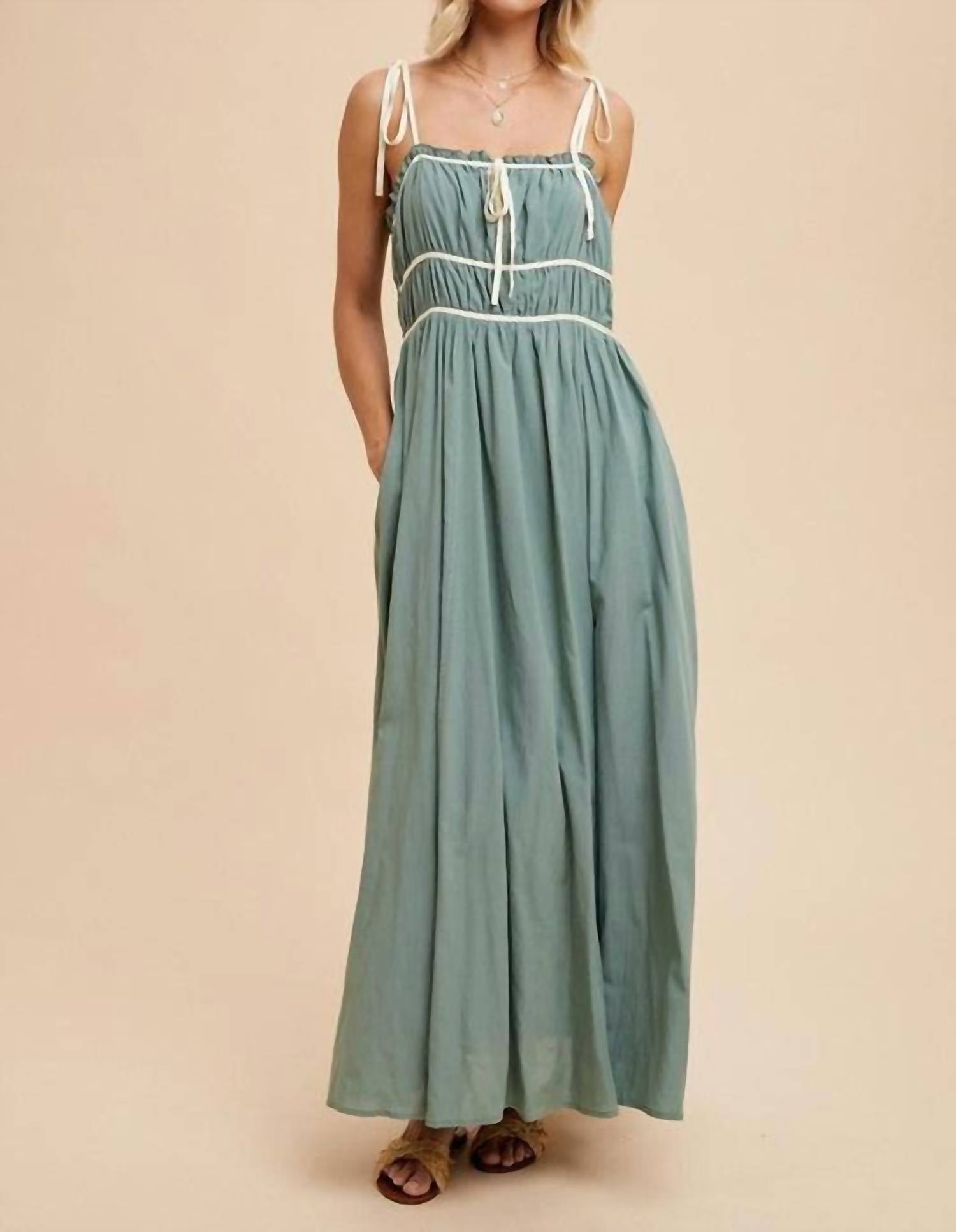 Discover the perfect blend of style and comfort with the Vivian Contrast Trim Maxi Dress by IN-LOOM, a must-have for your fall wardrobe. This feminine A-line dress showcases elegant spaghetti straps that tie effortlessly, paired with a sophisticated square neckline that exudes modern boho chic. Crafted from a luxurious cotton blend, the dress features a pull-on closure and practical side pockets, adding both style and functionality.