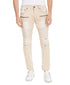 Corte justo | Braguilha com zíper e botão | Dois bolsos frontais; bolso para moedas; dois zíperes; dois bolsos traseiros | Estilo rasgado e reparado | Algodão/poliéster/elastano | Lavável à máquina